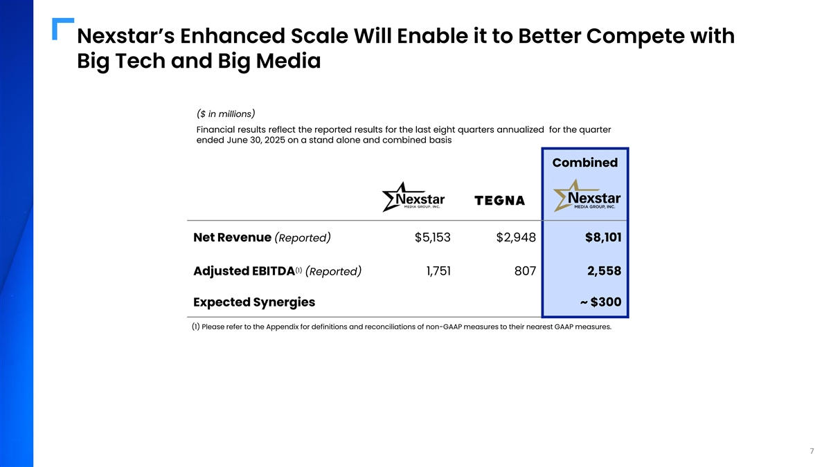 Enhances Nexstar’s Position as a Leading Local Media Company Note: Statistics reflect our and our partners’ stations. Combined Television Stations Full-power Stations 265 versus 201 stand alone Combined Audience Reach U.S. TV Households 80% versus 70% stand alone Combined DMAs U.S. 132 DMAs versus 116 stand alone 9 of the Top 10 DMAs 41 of the Top 50 DMAs Enhanced Local Presence of TEGNA’s 51 DMAs 35 overlap with Nexstar DMAs Increased Presence in Nexstar TEGNA Both Contested Election Markets Phoenix, AZ, Atlanta, GA, Toledo, OH, Portland, ME 6
