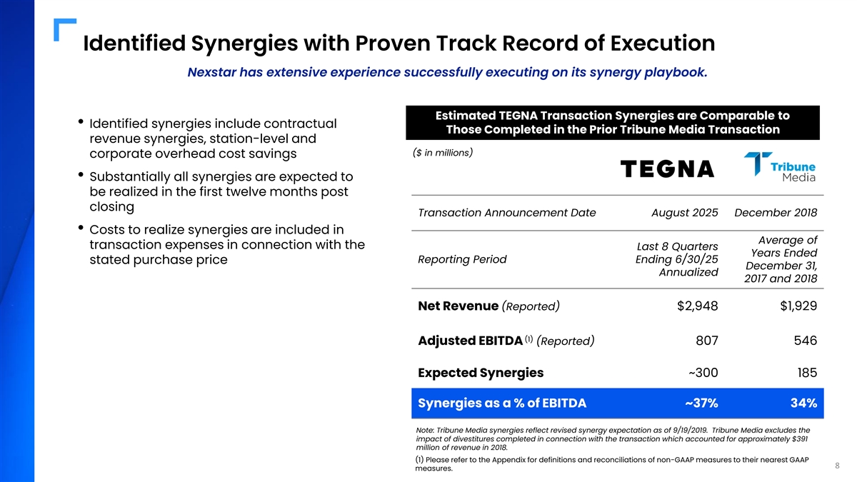 Nexstar’s Enhanced Scale Will Enable it to Better Compete with Big Tech and Big Media ($ in millions) Financial results reflect the reported results for the last eight quarters annualized for the quarter ended June 30, 2025 on a stand alone and combined basis Combined Net Revenue (Reported) $5,153 $2,948 $8,101 (1) Adjusted EBITDA (Reported) 1,751 807 2,558 Expected Synergies ~ $300 (1) Please refer to the Appendix for definitions and reconciliations of non-GAAP measures to their nearest GAAP measures. 7