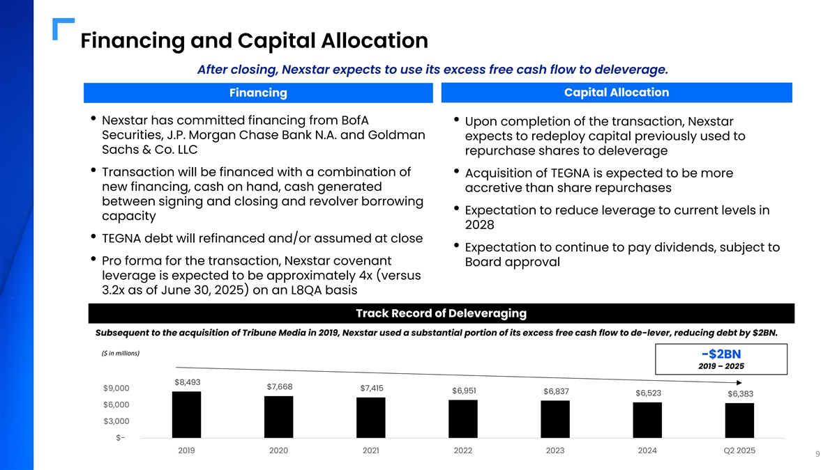 Identified Synergies with Proven Track Record of Execution Nexstar has extensive experience successfully executing on its synergy playbook. Estimated TEGNA Transaction Synergies are Comparable to • Identified synergies include contractual Those Completed in the Prior Tribune Media Transaction revenue synergies, station-level and ($ in millions) corporate overhead cost savings • Substantially all synergies are expected to be realized in the first twelve months post closing Transaction Announcement Date August 2025 December 2018 • Costs to realize synergies are included in Average of transaction expenses in connection with the Last 8 Quarters Years Ended Reporting Period Ending 6/30/25 stated purchase price December 31, Annualized 2017 and 2018 Net Revenue (Reported) $2,948 $1,929 (1) Adjusted EBITDA (Reported) 807 546 Expected Synergies ~300 185 Synergies as a % of EBITDA ~37% 34% Note: Tribune Media synergies reflect revised synergy expectation as of 9/19/2019. Tribune Media excludes the impact of divestitures completed in connection with the transaction which accounted for approximately $391 million of revenue in 2018. (1) Please refer to the Appendix for definitions and reconciliations of non-GAAP measures to their nearest GAAP 8 measures.