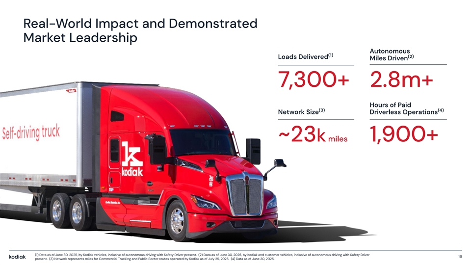 History of Reaching Major Milestones 2018 - 2021 2022 2023 2024 2025 APR ‘18 JUL ’19 JUN ‘22 OCT ‘22 MAR ‘23 DEC ‘23 JAN ‘24 MAY ‘24 JUL ‘24 SEP ‘24 MAR ‘25 Kodiak First SensorPods Awarded U.S. 24/6 Ford F-150 Launch of Gen6 Partnership MSA signed Driverless Surpassed 750 founded autonomous introduced DoD Program of DAL <> ATL unveiled - driverless-ready with Textron with Atlas Textron hours of commercial Record contract operations autonomous Systems for Energy Systems commercial truck platform delivery for autonomous off-road unmanned RIPSAW® M3 driverless in Texas Army ground vehicle for military vehicle unveiled operations vehicles DoD DEC ‘23 MAY ‘24 JUL ‘24 DEC ‘24 MAR ‘25 Houston First Kodiak, J.B. Delivered first First 100 truck truckport commercial Hunt, and 2 driverless commitment established driverless Bridgestone Kodiak from Atlas with Ryder freight delivery collaboration Driver-equipped semi-trucks to Atlas Select Commercial (1) Partners (1) Kodiak has also announced partnerships with IKEA, Loadsmith, and Maersk, and has a number of other yet to be announced partnerships. 15