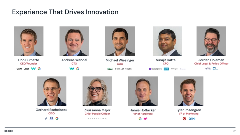 Kodiak’s Core Value: Safety First, and Always Kodiak’s Safety Case Framework Safety is the foundation of everything we build. It’s not an afterthought—it’s the driving force behind what we do and why we do it. Safety Culture Engineered Manufacturing & SMS to Drive Safely and Quality Kodiak’s Safety Case Framework is a structured approach that provides clear, evidence-backed reasoning for how we manage the risks of autonomous vehicle operations, fostering confidence among customers, regulators, and the general public. Operationally Vigilant on Field Monitoring & Safe Cyber Security Continuous Improvement 19