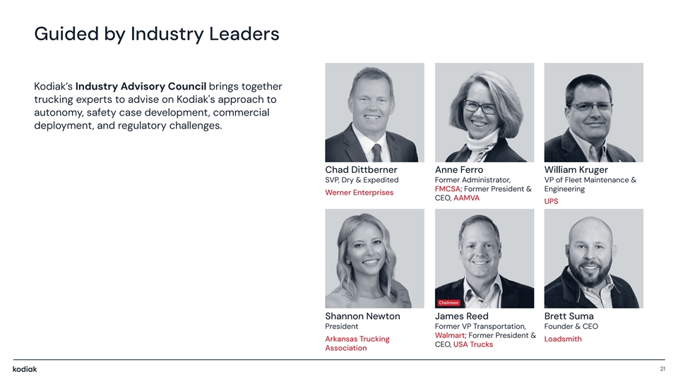 Guided by Industry Leaders Kodiak’s Industry Advisory Council brings together trucking experts to advise on Kodiak's approach to autonomy, safety case development, commercial deployment, and regulatory challenges. Chad Dittberner Anne Ferro William Kruger SVP, Dry & Expedited Former Administrator, VP of Fleet Maintenance & FMCSA; Former President & Engineering Werner Enterprises CEO, AAMVA UPS Shannon Newton James Reed Brett Suma President Former VP Transportation, Founder & CEO Walmart; Former President & Arkansas Trucking Loadsmith CEO, USA Trucks Association 21