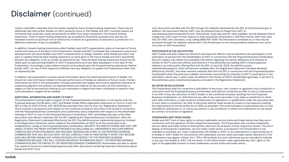 Disclaimer (continued) results could differ materially from the results implied by these forward-looking statements. There may be such documents are filed with the SEC through the website maintained by the SEC at http://www.sec.gov. In additional risks that neither Kodiak nor AACT presently know or that Kodiak and AACT currently believe are addition, the documents filed by AACT may be obtained free of charge from AACT at immaterial that could also cause actual results to differ from those contained in the forward-looking www.aresacquisitioncorporationii.com. Alternatively, these documents, when available, can be obtained free of statements. These forward-looking statements are provided for illustrative purposes only and are not charge from AACT upon written request to Ares Acquisition Corporation II, 245 Park Avenue, 44th Floor, New intended to serve as and must not be relied on by investors as a guarantee, an assurance, a prediction or a York, NY 10167, Attn: Secretary, or by calling (888) 818-5298. The information contained on, or that may be definitive statement of fact or probability. accessed through the websites referenced in this Presentation is not incorporated by reference into, and is not a part of, this Presentation. In addition, forward-looking statements reflect Kodiak’s and AACT’s expectations, plans or forecasts of future events and views as of the date of this Presentation. Kodiak and AACT anticipate that subsequent events and PARTICIPANTS IN THE SOLICITATION developments will cause Kodiak’s and AACT’s assessments to change. However, while Kodiak and AACT may AACT, Kodiak and their respective directors and executive officers may be deemed to be participants in the elect to update these forward-looking statements at some point in the future, Kodiak and AACT specifically solicitation of proxies from the shareholders of AACT in connection with the Proposed Business Combination. disclaim any obligation to do so, except as required by law. These forward-looking statements should not be Security holders may obtain more detailed information regarding the names, affiliations and interests of relied upon as representing Kodiak’s or AACT’s assessments as of any date subsequent to the date of this certain of AACT’s executive officers and directors in the solicitation by reading AACT’s final prospectus Presentation. Accordingly, undue reliance should not be placed upon the forward-looking statements. Neither related to its initial public offering filed with the SEC on April 24, 2023, the definitive proxy Kodiak, AACT, nor any of their respective affiliates have any obligation to update this Presentation other than statement/prospectus, which will become available after the Registration Statement has been declared as required by law. effective by the SEC, and other relevant materials filed with the SEC in connection with the Proposed Business Combination when they become available. Information concerning the interests of AACT’s participants in the In addition, this presentation contains certain information about the historical performance of Kodiak. You solicitation, which may, in some cases, be different from those of AACT’s shareholders generally, is set forth in should not view information related to the past performance of Kodiak as indicative of future results. Certain the preliminary proxy statement/prospectus included in the Registration Statement. information set forth in this presentation includes estimates and targets and involves significant elements of subjective judgment and analysis. No representations are made as to the accuracy of such estimates or NO OFFER OR SOLICITATION targets or that all assumptions relating to such estimates or targets have been considered or stated or that This Presentation shall not constitute a solicitation of any proxy, vote, consent or approval in any jurisdiction in such estimates or targets will be realized. connection with the Proposed Business Combination and shall not constitute an offer to sell or a solicitation of an offer to buy the securities of AACT, Kodiak or the combined company resulting from the Proposed ADDITIONAL INFORMATION AND WHERE TO FIND IT Business Combination, nor shall there be any sale of any such securities in any state or jurisdiction in which This presentation is being made in respect of the Proposed Business Combination. In connection with the such offer, solicitation, or sale would be unlawful prior to registration or qualification under the securities laws Proposed Business Combination, AACT and Kodiak initially filed a registration statement on Form S-4 with the of such state or jurisdiction. No offer of securities shall be made except by means of a prospectus meeting SEC on May 14, 2025 (File No. 333-287278) (as amended from time to time, the “Registration Statement”), the requirements of the Securities Act of 1933, as amended. This communication is restricted by law; it is not which includes a prospectus with respect to the combined company’s securities to be issued in connection intended for distribution to, or use by any person in, any jurisdiction in where such distribution or use would with the Proposed Business Combination and a preliminary proxy statement with respect to the shareholder be contrary to local law or regulation. meeting of AACT to vote on the Proposed Business Combination. AACT and Kodiak also plan to file other documents and relevant materials with the SEC regarding the Proposed Business Combination. After the TRADEMARKS AND TRADE NAMES Registration Statement is declared effective by the SEC, the definitive proxy statement/prospectus included Kodiak and AACT own or have rights to various trademarks, service marks and trade names that they use in in the Registration Statement will be mailed to the shareholders of AACT as of the record date to be connection with the operation of their respective businesses. This Presentation also contains trademarks, established f