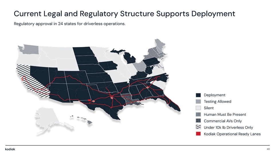 Current Legal and Regulatory Structure Supports Deployment Regulatory approval in 24 states for driverless operations. Deployment Testing Allowed Silent Human Must Be Present Commercial AVs Only Under 10k lb Driverless Only Kodiak Operational Ready Lanes 40