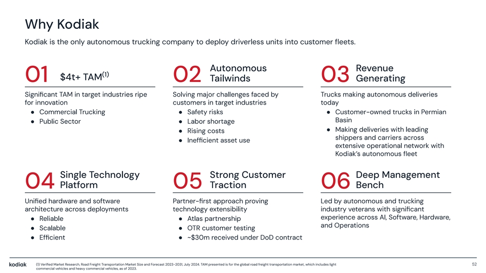 Why Kodiak Kodiak is the only autonomous trucking company to deploy driverless units into customer fleets. Autonomous Revenue (1) $4t+ TAM Tailwinds Generating 01 02 03 Significant TAM in target industries ripe Solving major challenges faced by Trucks making autonomous deliveries for innovation customers in target industries today ● Commercial Trucking● Safety risks● Customer-owned trucks in Permian Basin ● Public Sector● Labor shortage ● Making deliveries with leading ● Rising costs shippers and carriers across ● Inefficient asset use extensive operational network with Kodiak’s autonomous fleet Single Technology Strong Customer Deep Management Platform Traction Bench 04 05 06 Unified hardware and software Partner-first approach proving Led by autonomous and trucking architecture across deployments technology extensibility industry veterans with significant experience across AI, Software, Hardware, ● Reliable● Atlas partnership and Operations ● Scalable● OTR customer testing ● Efficient● ~$30m received under DoD contract (1) Verified Market Research, Road Freight Transportation Market Size and Forecast 2023-2031, July 2024. TAM presented is for the global road freight transportation market, which includes light 52 commercial vehicles and heavy commercial vehicles, as of 2023.