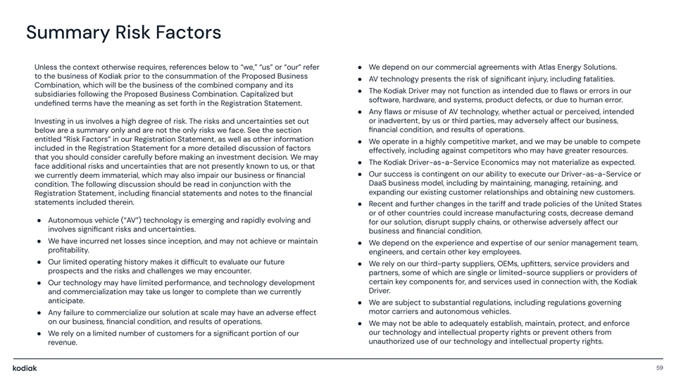 Summary Risk Factors Unless the context otherwise requires, references below to “we,” “us” or “our” refer ● We depend on our commercial agreements with Atlas Energy Solutions. to the business of Kodiak prior to the consummation of the Proposed Business ● AV technology presents the risk of significant injury, including fatalities. Combination, which will be the business of the combined company and its ● The Kodiak Driver may not function as intended due to flaws or errors in our subsidiaries following the Proposed Business Combination. Capitalized but software, hardware, and systems, product defects, or due to human error. undefined terms have the meaning as set forth in the Registration Statement. ● Any flaws or misuse of AV technology, whether actual or perceived, intended or inadvertent, by us or third parties, may adversely affect our business, Investing in us involves a high degree of risk. The risks and uncertainties set out financial condition, and results of operations. below are a summary only and are not the only risks we face. See the section entitled “Risk Factors” in our Registration Statement, as well as other information ● We operate in a highly competitive market, and we may be unable to compete included in the Registration Statement for a more detailed discussion of factors effectively, including against competitors who may have greater resources. that you should consider carefully before making an investment decision. We may ● The Kodiak Driver-as-a-Service Economics may not materialize as expected. face additional risks and uncertainties that are not presently known to us, or that ● Our success is contingent on our ability to execute our Driver-as-a-Service or we currently deem immaterial, which may also impair our business or financial DaaS business model, including by maintaining, managing, retaining, and condition. The following discussion should be read in conjunction with the expanding our existing customer relationships and obtaining new customers. Registration Statement, including financial statements and notes to the financial statements included therein. ● Recent and further changes in the tariff and trade policies of the United States or of other countries could increase manufacturing costs, decrease demand ● Autonomous vehicle (“AV”) technology is emerging and rapidly evolving and for our solution, disrupt supply chains, or otherwise adversely affect our involves significant risks and uncertainties. business and financial condition. ● We have incurred net losses since inception, and may not achieve or maintain ● We depend on the experience and expertise of our senior management team, profitability. engineers, and certain other key employees. ● Our limited operating history makes it difficult to evaluate our future ● We rely on our third-party suppliers, OEMs, upfitters, service providers and prospects and the risks and challenges we may encounter. partners, some of which are single or limited-source suppliers or providers of certain key components for, and services used in connection with, the Kodiak ● Our technology may have limited performance, and technology development Driver. and commercialization may take us longer to complete than we currently anticipate. ● We are subject to substantial regulations, including regulations governing motor carriers and autonomous vehicles. ● Any failure to commercialize our solution at scale may have an adverse effect on our business, financial condition, and results of operations. ● We may not be able to adequately establish, maintain, protect, and enforce our technology and intellectual property rights or prevent others from ● We rely on a limited number of customers for a significant portion of our unauthorized use of our technology and intellectual property rights. revenue. 59