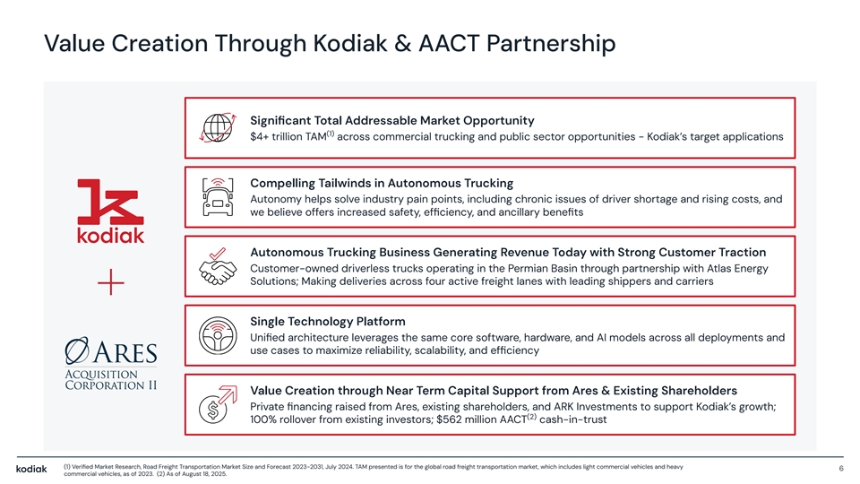 Value Creation Through Kodiak & AACT Partnership Significant Total Addressable Market Opportunity (1) $4+ trillion TAM across commercial trucking and public sector opportunities - Kodiak’s target applications Compelling Tailwinds in Autonomous Trucking Autonomy helps solve industry pain points, including chronic issues of driver shortage and rising costs, and we believe offers increased safety, efficiency, and ancillary benefits Autonomous Trucking Business Generating Revenue Today with Strong Customer Traction Customer-owned driverless trucks operating in the Permian Basin through partnership with Atlas Energy Solutions; Making deliveries across four active freight lanes with leading shippers and carriers Single Technology Platform Unified architecture leverages the same core software, hardware, and AI models across all deployments and use cases to maximize reliability, scalability, and efficiency Value Creation through Near Term Capital Support from Ares & Existing Shareholders Private financing raised from Ares, existing shareholders, and ARK Investments to support Kodiak’s growth; (2) 100% rollover from existing investors; $562 million AACT cash-in-trust (1) Verified Market Research, Road Freight Transportation Market Size and Forecast 2023-2031, July 2024. TAM presented is for the global road freight transportation market, which includes light commercial vehicles and heavy 6 commercial vehicles, as of 2023. (2) As of August 18, 2025.