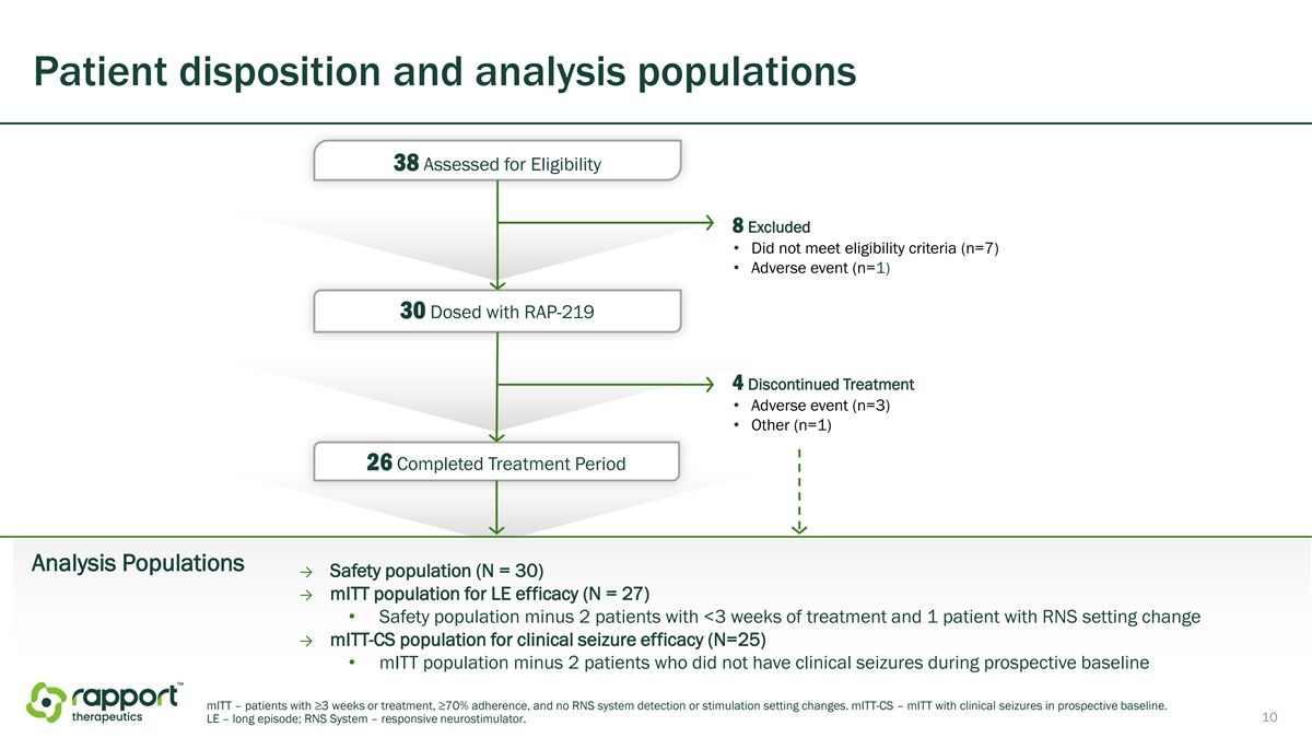 Phase 2a trial in drug-resistant focal onset seizure patients 8-week open-label 8-week 12-week pre-treatment period treatment period follow-up period 4-week 8-week Retrospective Prospective 0.75 mg x 5 days then 1.25 mg QD RAP-219 Washout Baseline Baseline Clinical seizure End of Start of End of a baseline treatment treatment trial b Long Episode (LE) baseline Key Entry Criteria Key Endpoints 1. Drug-resistant focal onset seizures • LE reduction (power determinations based on this outcome measure) ® 2. RNS probe implanted in seizure onset zone within mesial temporal • Proportion of patients with ≥30% reduction compared with LE baseline lobe (MTL) ≥15 months before screening • Median percent change from LE baseline 3. Stable RNS System settings and other therapies • Clinical seizure reduction 4. ≥16 LEs during 8-week retrospective review period • Proportion of patients with ≥50% reduction compared with pre- 5. ≥1 clinical seizure reported during 8-week retrospective review period treatment baseline; proportion of patients who achieved seizure freedom 6. >50% concordance between LEs and electrographic seizures • Median percent change from baseline a Patients with no clinical seizures during the prospective baseline period were allowed to enter the treatment period. b LE baseline was defined as the 12 weeks preceding the initiation of treatment (the combination of the 8-week retrospective, and 4-week prospective baseline periods) 9 LE – long episode; MTL – mesial temporal lobe; RNS System – responsive neurostimulator; QD – once daily