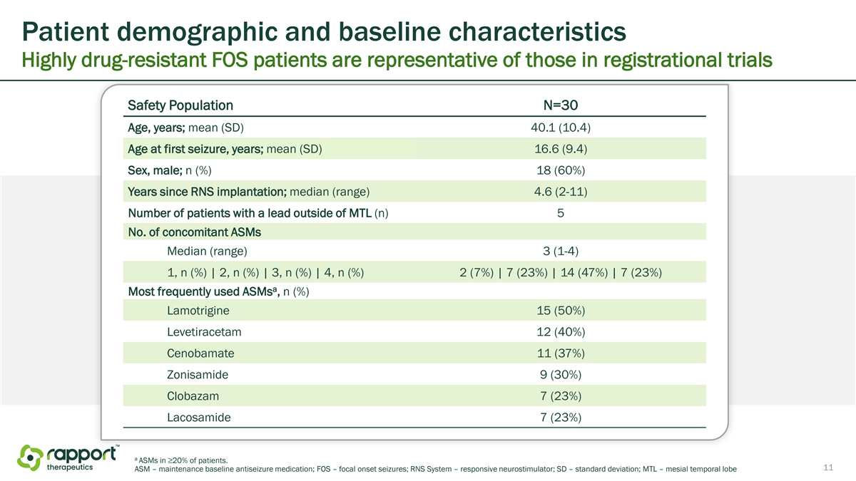 Patient disposition and analysis populations 38 Assessed for Eligibility 8 Excluded • Did not meet eligibility criteria (n=7) • Adverse event (n=1) 30 Dosed with RAP-219 4 Discontinued Treatment • Adverse event (n=3) • Other (n=1) 26 Completed Treatment Period Analysis Populations → Safety population (N = 30) → mITT population for LE efficacy (N = 27) • Safety population minus 2 patients with <3 weeks of treatment and 1 patient with RNS setting change → mITT-CS population for clinical seizure efficacy (N=25) • mITT population minus 2 patients who did not have clinical seizures during prospective baseline mITT – patients with ≥3 weeks or treatment, ≥70% adherence, and no RNS system detection or stimulation setting changes. mITT-CS – mITT with clinical seizures in prospective baseline. 10 LE – long episode; RNS System – responsive neurostimulator.