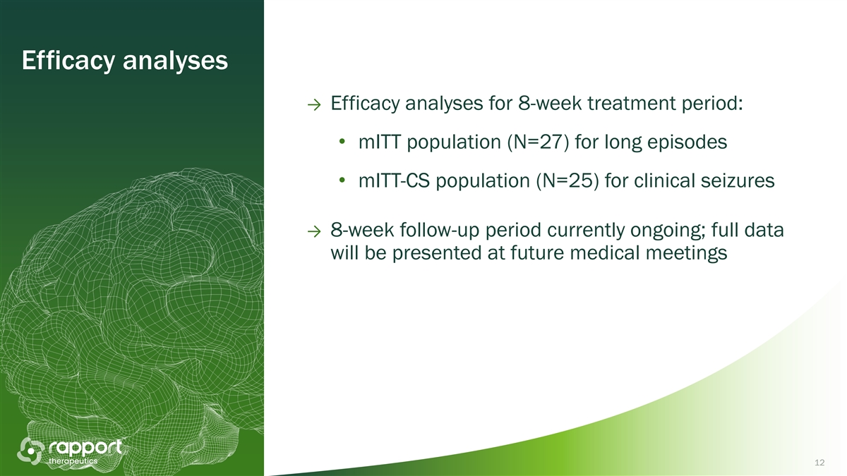 Efficacy analyses → Efficacy analyses for 8-week treatment period: • mITT population (N=27) for long episodes • mITT-CS population (N=25) for clinical seizures → 8-week follow-up period currently ongoing; full data will be presented at future medical meetings 12