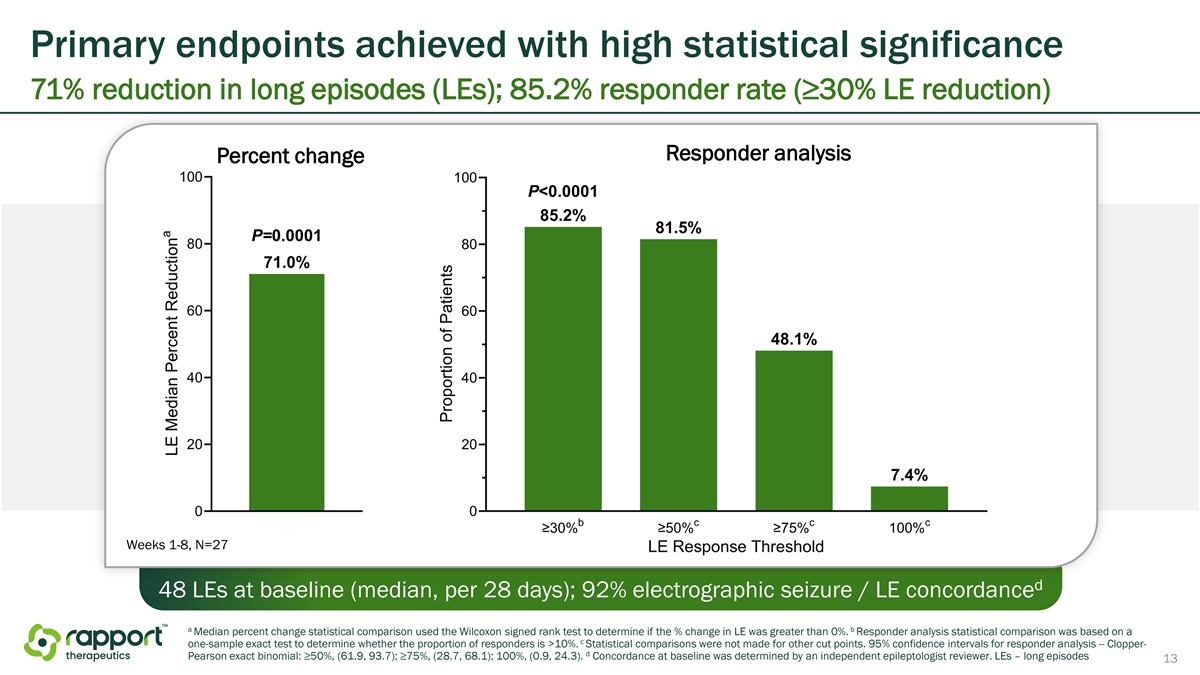 Efficacy findings from the Phase 2a trial achieved statistically significant results for primary long episode (“LE”) endpoints and key secondary endpoints of clinical seizures. In the 8-week treatment period, 85.2% of patients achieved ≥30% reduction in LEs from baseline (p<0.0001), 72.0% achieved ≥50% reduction in clinical seizures from baseline (p<0.0001), and 24% of patients achieved seizure freedom for the 8-week treatment period (p<0.0001). Topline efficacy data are shown in the following table.