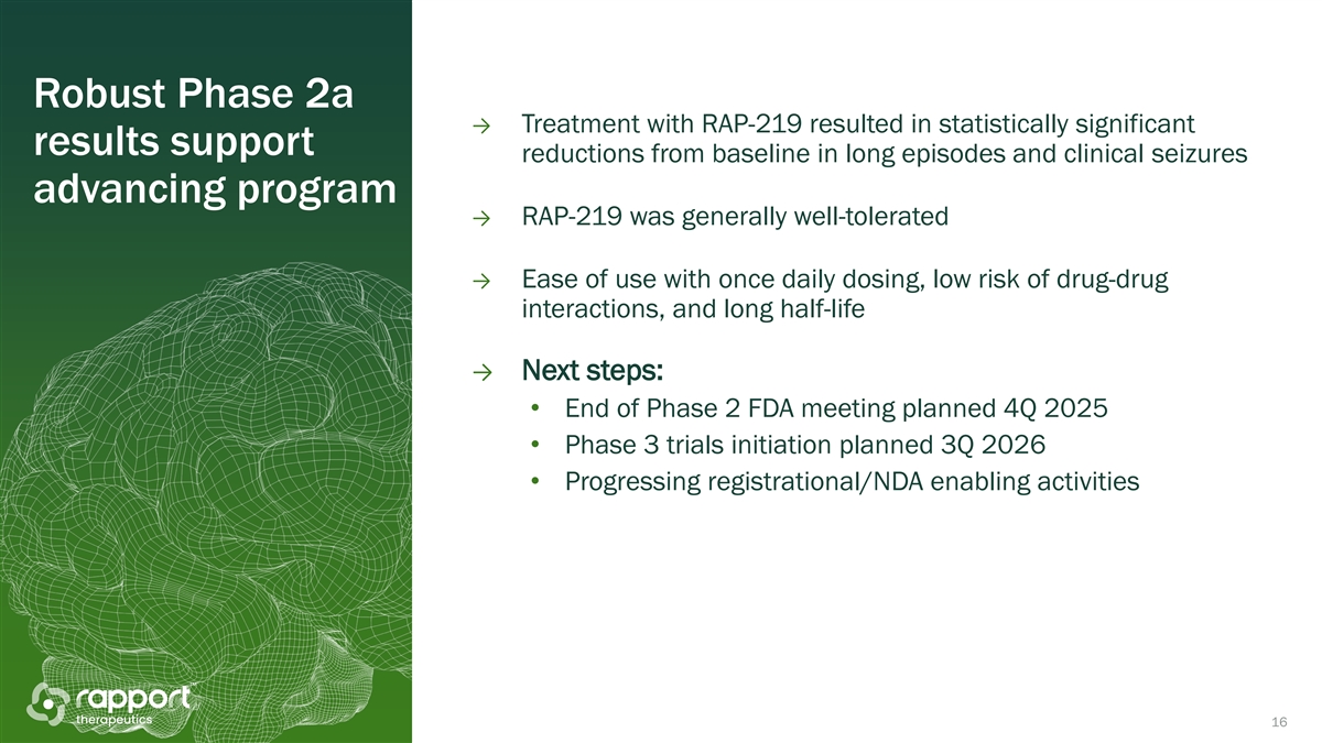 Robust Phase 2a → Treatment with RAP-219 resulted in statistically significant results support reductions from baseline in long episodes and clinical seizures advancing program → RAP-219 was generally well-tolerated → Ease of use with once daily dosing, low risk of drug-drug interactions, and long half-life → Next steps: • End of Phase 2 FDA meeting planned 4Q 2025 • Phase 3 trials initiation planned 3Q 2026 • Progressing registrational/NDA enabling activities 16