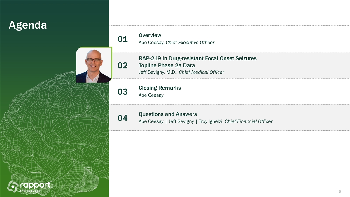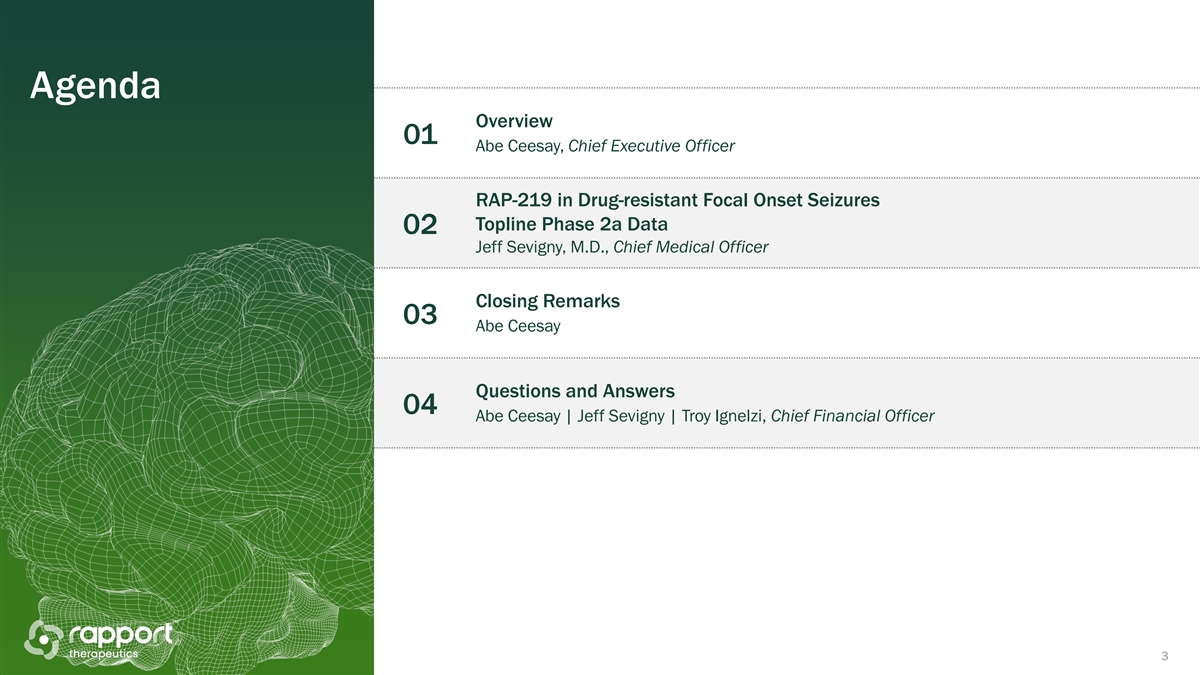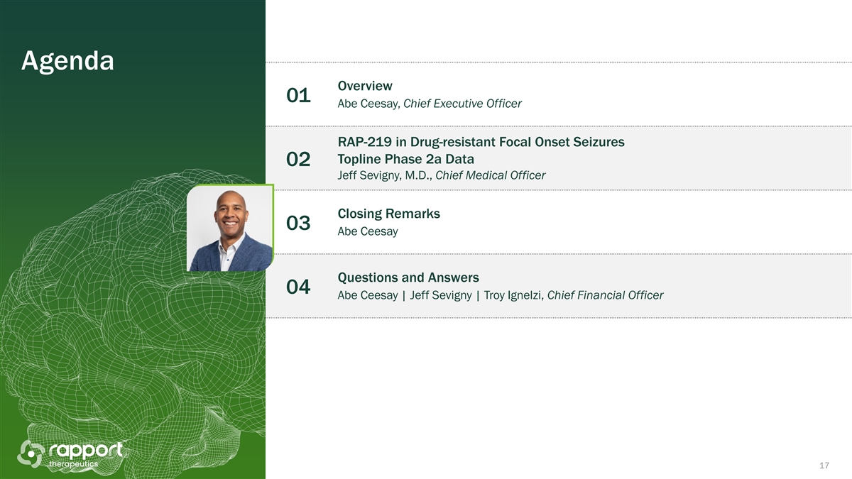 Agenda Overview 01 Abe Ceesay, Chief Executive Officer RAP-219 in Drug-resistant Focal Onset Seizures Topline Phase 2a Data 02 Jeff Sevigny, M.D., Chief Medical Officer Closing Remarks 03 Abe Ceesay Questions and Answers 04 Abe Ceesay | Jeff Sevigny | Troy Ignelzi, Chief Financial Officer 17