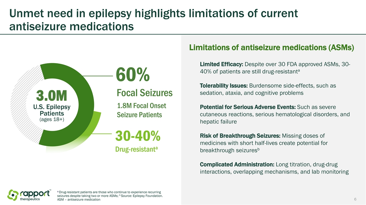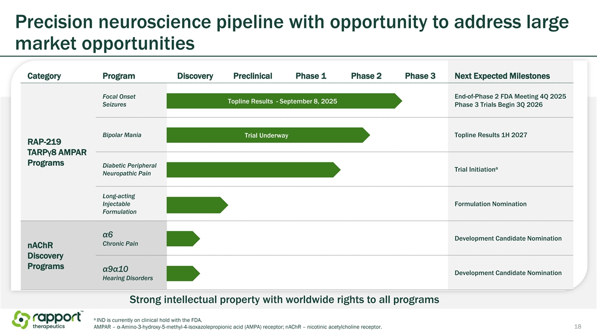 Disclaimer This presentation contains “forward-looking statements” within the meaning of Section 27A of the Securities Act of 1933 and Section 21E of the Securities Exchange Act of 1934, each as amended. The words “anticipate,” “believe,” “continue,” “could,” “estimate,” “expect,” “intend,” “may,” “plan,” “potential,” “predict,” “project,” “should,” “target,” “will,” “would” and similar expressions are intended to identify forward-looking statements, although not all forward-looking statements contain these identifying words. These forward-looking statements include, but are not limited to, express or implied statements regarding: the clinical development of RAP-219 for the treatment of focal onset seizures, bipolar mania and diabetic peripheral neuropathic pain, including the initiation, timing, progress and results of the Company's Phase 3 clinical trials in focal onset seizures, and a Phase 2a clinical trial of RAP-219 in bipolar mania, as well as other planned clinical trials; expectations for the activity, tolerability, and commercial potential of RAP-219; the future release of data from the ongoing 8-week follow-up period of the Phase 2a trial for RAP-219; expectations for a long-acting injectable (LAI) formulation of RAP-219 and the potential of a LAI to improve patient adherence; the Company's expectations for upcoming regulatory interactions; the potential of Rapport's RAP technology platform; the advancement of the Company's discovery programs; and expectations for Rapport's uses of capital, expenses and financial results, including its cash runway through the end of 2026. Forward-looking statements are based on management’s current expectations and are subject to risks and uncertainties that could negatively affect Rapport’s business, operating results, financial condition and stock value. Factors that could cause actual results to differ materially from those currently anticipated include: risks relating to the Company’s research and development activities; Rapport’s ability to execute on its strategy including obtaining the requisite regulatory approvals on the expected timeline, if at all; uncertainties relating to preclinical and clinical development activities; the Company’s dependence on third parties to conduct clinical trials, manufacture its product candidates and develop and commercialize its product candidates, if approved; Rapport’s ability to attract, integrate and retain key personnel; risks related to the Company’s financial condition and need for substantial additional funds in order to complete development activities and commercialize a product candidate, if approved; risks related to regulatory developments and approval processes of the U.S. Food and Drug Administration and comparable foreign regulatory authorities; risks related to establishing and maintaining Rapport’s intellectual property protections; and risks related to the competitive landscape for Rapport’s product candidates; as well as other risks described in “Risk Factors,” in the Company’s Annual Report on Form 10-K and most recent Quarterly Report on Form 10-Q, as well as discussions of potential risks, uncertainties, and other important factors in Rapport’s subsequent filings with the Securities and Exchange Commission. Any forward-looking statements represent Rapport’s views only as of today and should not be relied upon as representing its views as of any subsequent date. Rapport expressly disclaims any obligation or undertaking to release publicly any updates or revisions to any forward-looking statements contained herein to reflect any change in its expectations or any changes in events, conditions or circumstances on which any such statement is based, except as required by law, and claims the protection of the safe harbor for forward-looking statements contained in the Private Securities Litigation Reform Act of 1995. 2