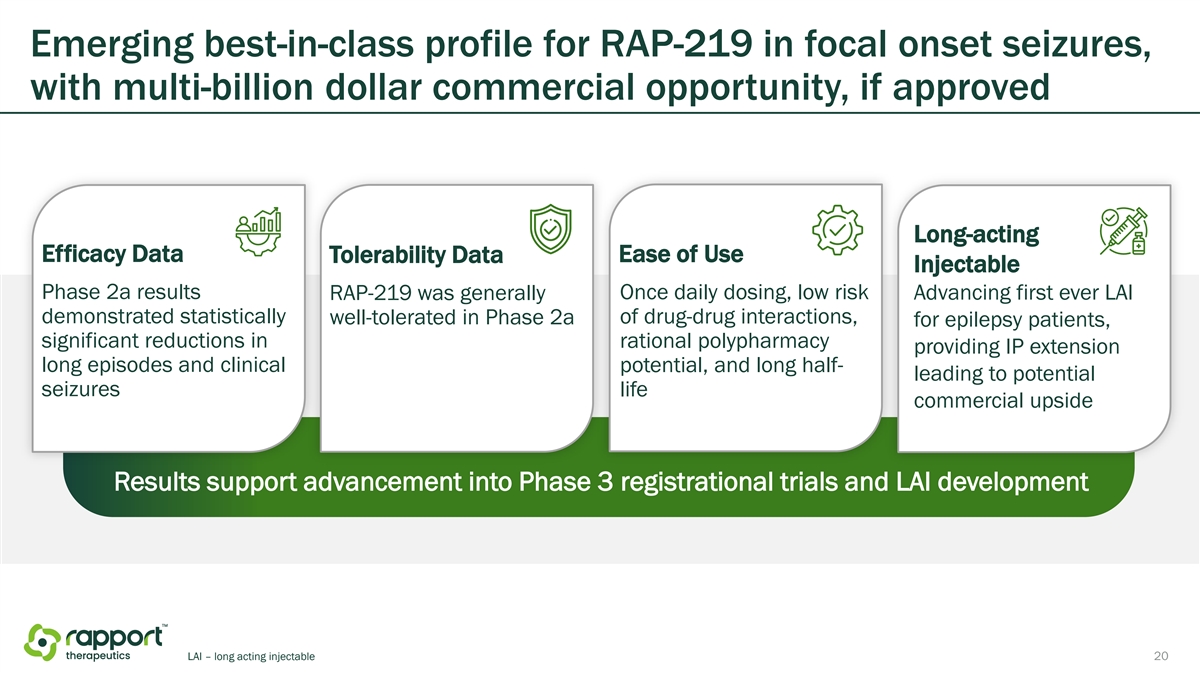 Additionally, Rapport continues development of a long-acting injectable (LAI) formulation of RAP-219. Up to half of patients are nonadherent to prescribed ASMs, which can present a significant issue in optimizing treatment benefit and lead to potential breakthrough seizures. The Company believes a LAI formulation has the potential to improve patient adherence and expand the potential clinical utility across all of RAP-219’s indications.