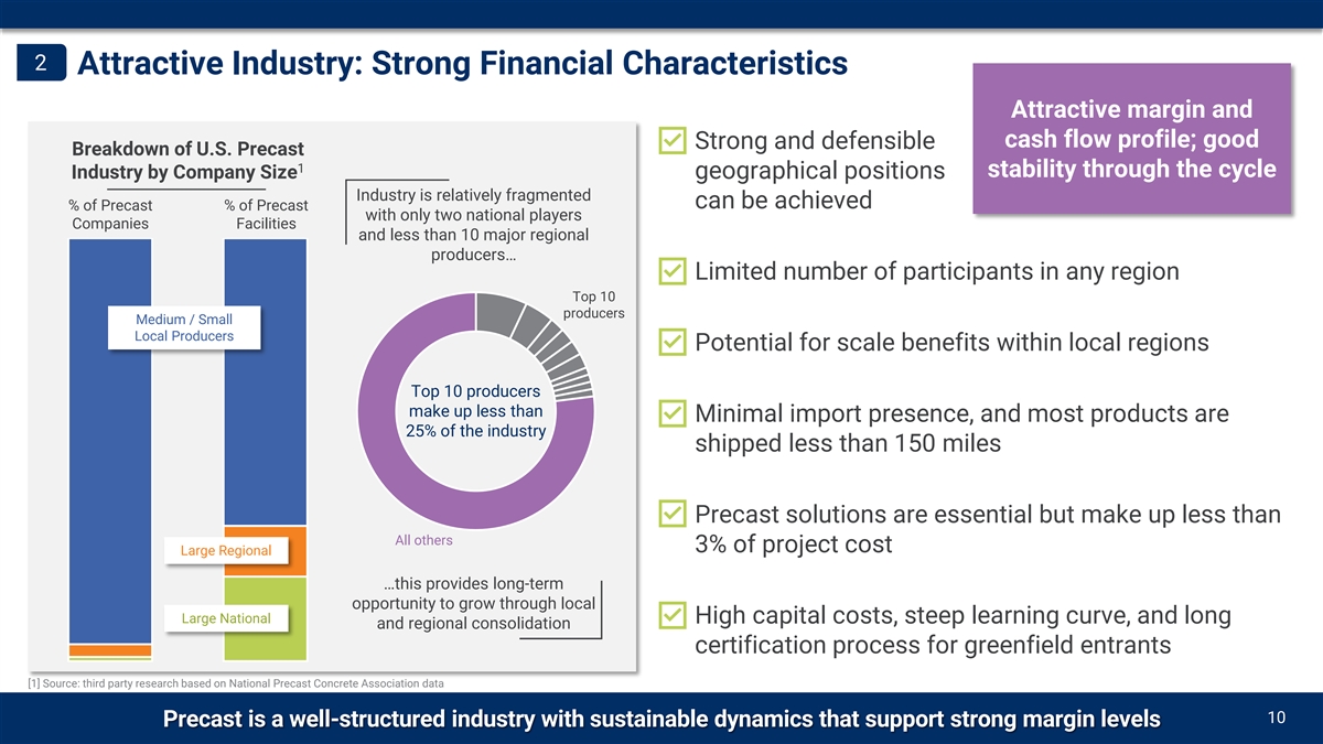 2 Attractive Industry: Strong Financial Characteristics Attractive margin and cash flow profile; good Strong and defensible Breakdown of U.S. Precast 1 stability through the cycle Industry by Company Size geographical positions Industry is relatively fragmented can be achieved % of Precast % of Precast with only two national players Companies Facilities and less than 10 major regional producers… Limited number of participants in any region Top 10 producers Medium / Small Local Producers Potential for scale benefits within local regions Top 10 producers make up less than Minimal import presence, and most products are 25% of the industry shipped less than 150 miles Precast solutions are essential but make up less than All others 3% of project cost Large Regional …this provides long-term opportunity to grow through local Large National High capital costs, steep learning curve, and long and regional consolidation certification process for greenfield entrants [1] Source: third party research based on National Precast Concrete Association data CMC Acquires X 10 Precast is a well-structured industry with sustainable dynamics that support strong margin levels
