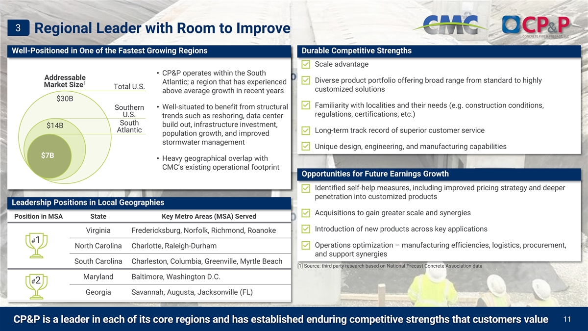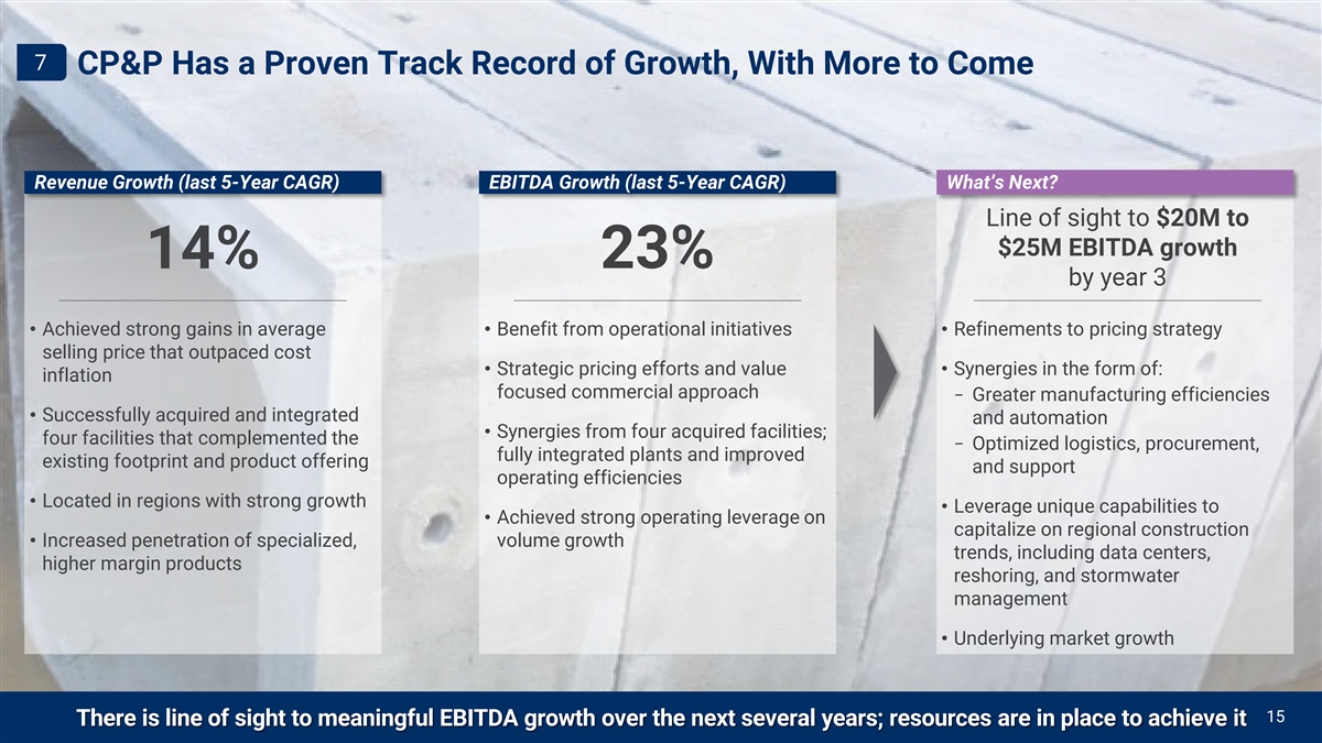 Key Investment Highlights 1 Broadens CMC’s commercial portfolio 2 Entry into an attractive industry 3 Regional leader with room to improve 4 Platform investment with scalability 5 Geographical overlap maximizes value levers 6 Enhances CMC’s financial profile CP&P has a proven track record of growth, 7 with more to come