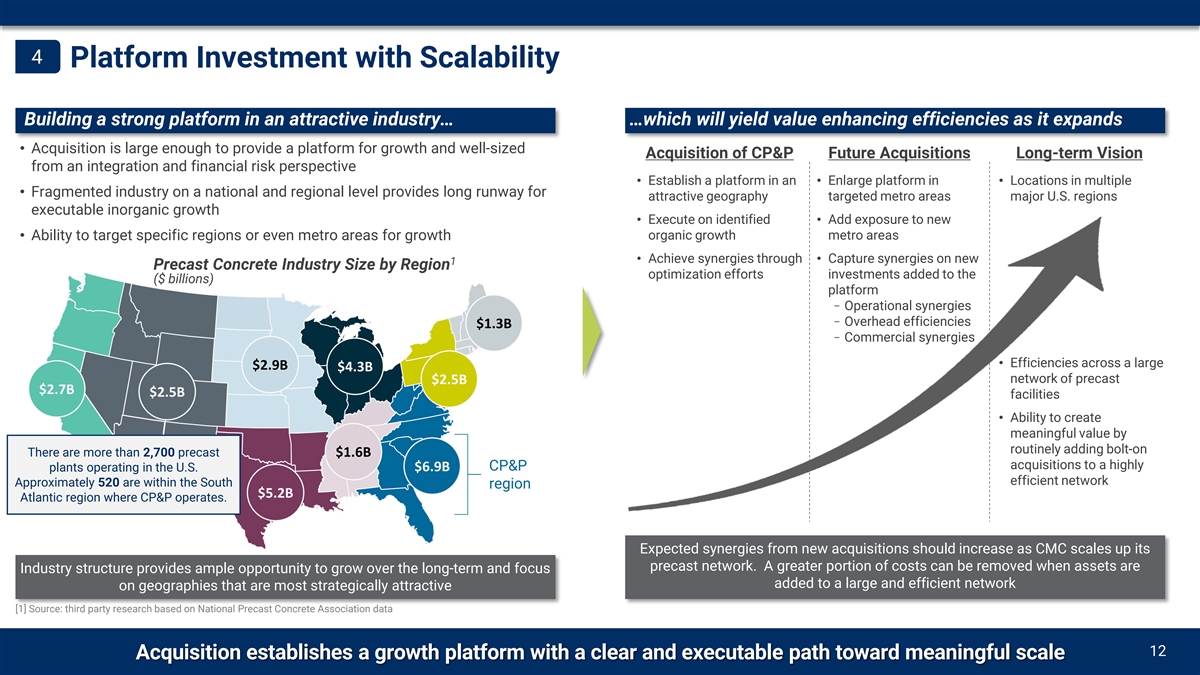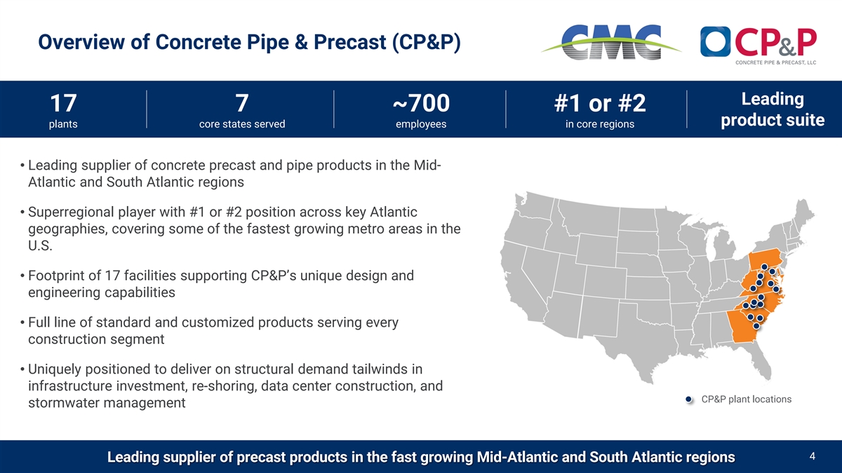 Compelling Strategic Rationale Improves CMC’s position with Expands CMC’s market targeted customer groups and leadership into the attractive expands participation on the precast concrete industry job-site Strong Strategic Fit Strengthens CMC’s core through Leverages existing leadership in early-stage Enhances financial profile of a broadening commercial construction and deep knowledge of CMC via higher, more stable portfolio and expected customers, market applications, and margins and cash flows synergies geographies Increased exposure to powerful Extends growth runway and structural trends driving creates a scalable platform construction activity 3 Highly complementary acquisition meeting CMC’s strategic criteria as we pursue value accretive, inorganic growth