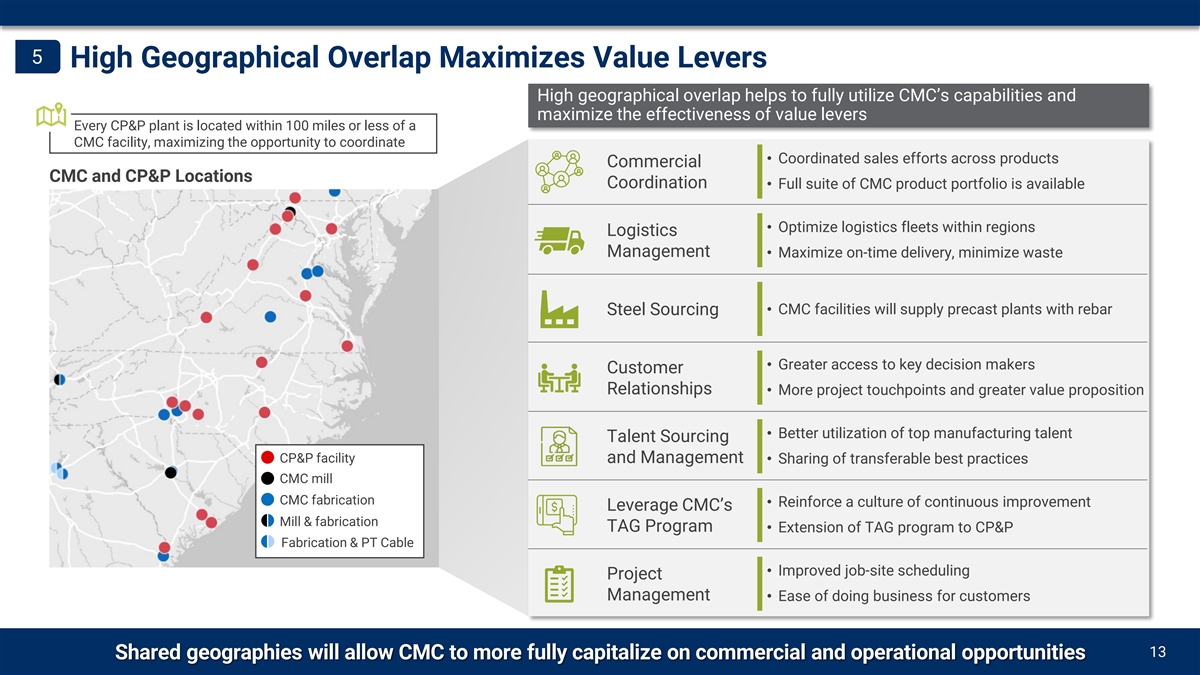 4 Platform Investment with Scalability Building a strong platform in an attractive industry… …which will yield value enhancing efficiencies as it expands • Acquisition is large enough to provide a platform for growth and well-sized Acquisition of CP&P Future Acquisitions Long-term Vision from an integration and financial risk perspective • Establish a platform in an • Enlarge platform in • Locations in multiple • Fragmented industry on a national and regional level provides long runway for attractive geography targeted metro areas major U.S. regions executable inorganic growth • Execute on identified • Add exposure to new • Ability to target specific regions or even metro areas for growth organic growth metro areas • Achieve synergies through • Capture synergies on new 1 Precast Concrete Industry Size by Region optimization efforts investments added to the ($ billions) platform − Operational synergies − Overhead efficiencies $1.3B − Commercial synergies • Efficiencies across a large $2.9B $4.3B $2.5B network of precast $2.7B $2.5B facilities • Ability to create meaningful value by routinely adding bolt-on There are more than 2,700 precast $1.6B acquisitions to a highly plants operating in the U.S. $6.9B CP&P efficient network Approximately 520 are within the South region $5.2B Atlantic region where CP&P operates. Expected synergies from new acquisitions should increase as CMC scales up its precast network. A greater portion of costs can be removed when assets are Industry structure provides ample opportunity to grow over the long-term and focus added to a large and efficient network on geographies that are most strategically attractive [1] Source: third party research based on National Precast Concrete Association data CMC Acquires X 12 Acquisition establishes a growth platform with a clear and executable path toward meaningful scale