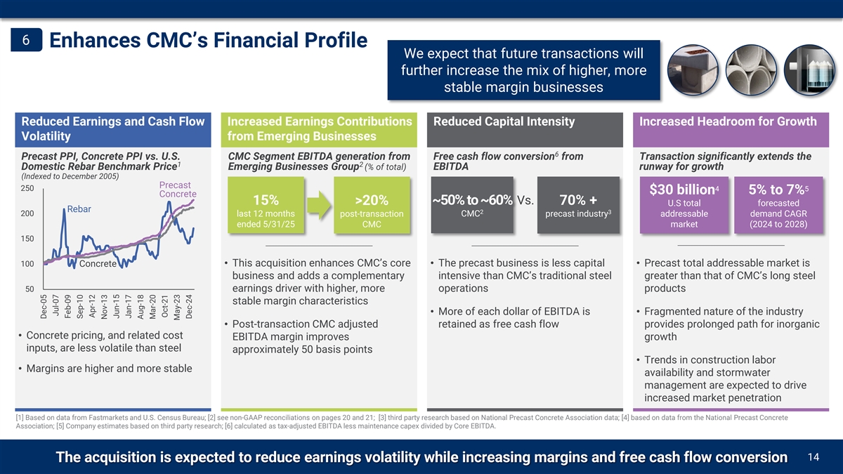 5 High Geographical Overlap Maximizes Value Levers High geographical overlap helps to fully utilize CMC’s capabilities and maximize the effectiveness of value levers Every CP&P plant is located within 100 miles or less of a CMC facility, maximizing the opportunity to coordinate • Coordinated sales efforts across products Commercial CMC and CP&P Locations Coordination • Full suite of CMC product portfolio is available • Optimize logistics fleets within regions Logistics Management • Maximize on-time delivery, minimize waste Steel Sourcing • CMC facilities will supply precast plants with rebar • Greater access to key decision makers Customer Relationships • More project touchpoints and greater value proposition • Better utilization of top manufacturing talent Talent Sourcing CP&P facility and Management • Sharing of transferable best practices CMC mill CMC fabrication • Reinforce a culture of continuous improvement Leverage CMC’s Mill & fabrication TAG Program • Extension of TAG program to CP&P Fabrication & PT Cable • Improved job-site scheduling Project Management • Ease of doing business for customers 13 Shared geographies will allow CMC to more fully capitalize on commercial and operational opportunities