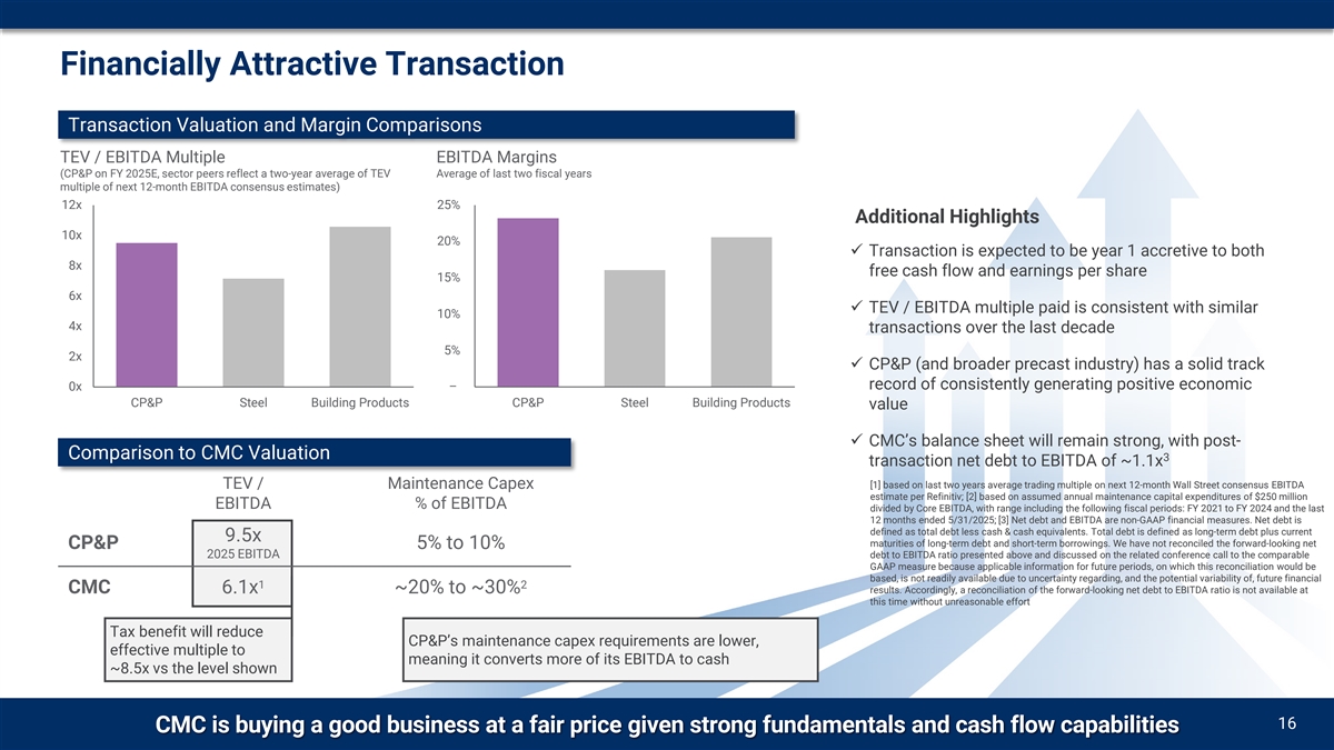 Financially Attractive Transaction Transaction Valuation and Margin Comparisons TEV / EBITDA Multiple EBITDA Margins (CP&P on FY 2025E, sector peers reflect a two-year average of TEV Average of last two fiscal years multiple of next 12-month EBITDA consensus estimates) 12x 25% Additional Highlights 10x 20% ü Transaction is expected to be year 1 accretive to both 8x free cash flow and earnings per share 15% 6x ü TEV / EBITDA multiple paid is consistent with similar 10% 4x transactions over the last decade 5% 2x ü CP&P (and broader precast industry) has a solid track – record of consistently generating positive economic 0x CP&P Steel Building Products CP&P Steel Building Products value ü CMC’s balance sheet will remain strong, with post- Comparison to CMC Valuation 3 transaction net debt to EBITDA of ~1.1x TEV / Maintenance Capex [1] based on last two years average trading multiple on next 12-month Wall Street consensus EBITDA estimate per Refinitiv; [2] based on assumed annual maintenance capital expenditures of $250 million EBITDA % of EBITDA divided by Core EBITDA, with range including the following fiscal periods: FY 2021 to FY 2024 and the last 12 months ended 5/31/2025; [3] Net debt and EBITDA are non-GAAP financial measures. Net debt is defined as total debt less cash & cash equivalents. Total debt is defined as long-term debt plus current 9.5x maturities of long-term debt and short-term borrowings. We have not reconciled the forward-looking net CP&P 5% to 10% 2025 EBITDA debt to EBITDA ratio presented above and discussed on the related conference call to the comparable GAAP measure because applicable information for future periods, on which this reconciliation would be based, is not readily available due to uncertainty regarding, and the potential variability of, future financial 1 2 CMC 6.1x ~20% to ~30% results. Accordingly, a reconciliation of the forward-looking net debt to EBITDA ratio is not available at this time without unreasonable effort Tax benefit will reduce CP&P’s maintenance capex requirements are lower, effective multiple to meaning it converts more of its EBITDA to cash ~8.5x vs the level shown 16 CMC is buying a good business at a fair price given strong fundamentals and cash flow capabilities
