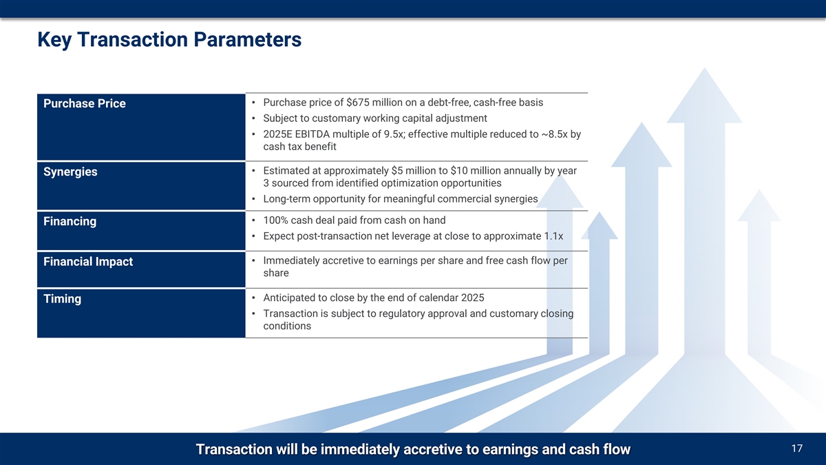 Key Transaction Parameters • Purchase price of $675 million on a debt-free, cash-free basis Purchase Price • Subject to customary working capital adjustment • 2025E EBITDA multiple of 9.5x; effective multiple reduced to ~8.5x by cash tax benefit • Estimated at approximately $5 million to $10 million annually by year Synergies 3 sourced from identified optimization opportunities • Long-term opportunity for meaningful commercial synergies • 100% cash deal paid from cash on hand Financing • Expect post-transaction net leverage at close to approximate 1.1x • Immediately accretive to earnings per share and free cash flow per Financial Impact share • Anticipated to close by the end of calendar 2025 Timing • Transaction is subject to regulatory approval and customary closing conditions 17 Transaction will be immediately accretive to earnings and cash flow