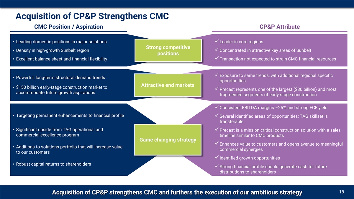 | • | Expands CMC’s commercial portfolio in early-stage construction solutions; leverages complementary geographic footprint and customer relationships |