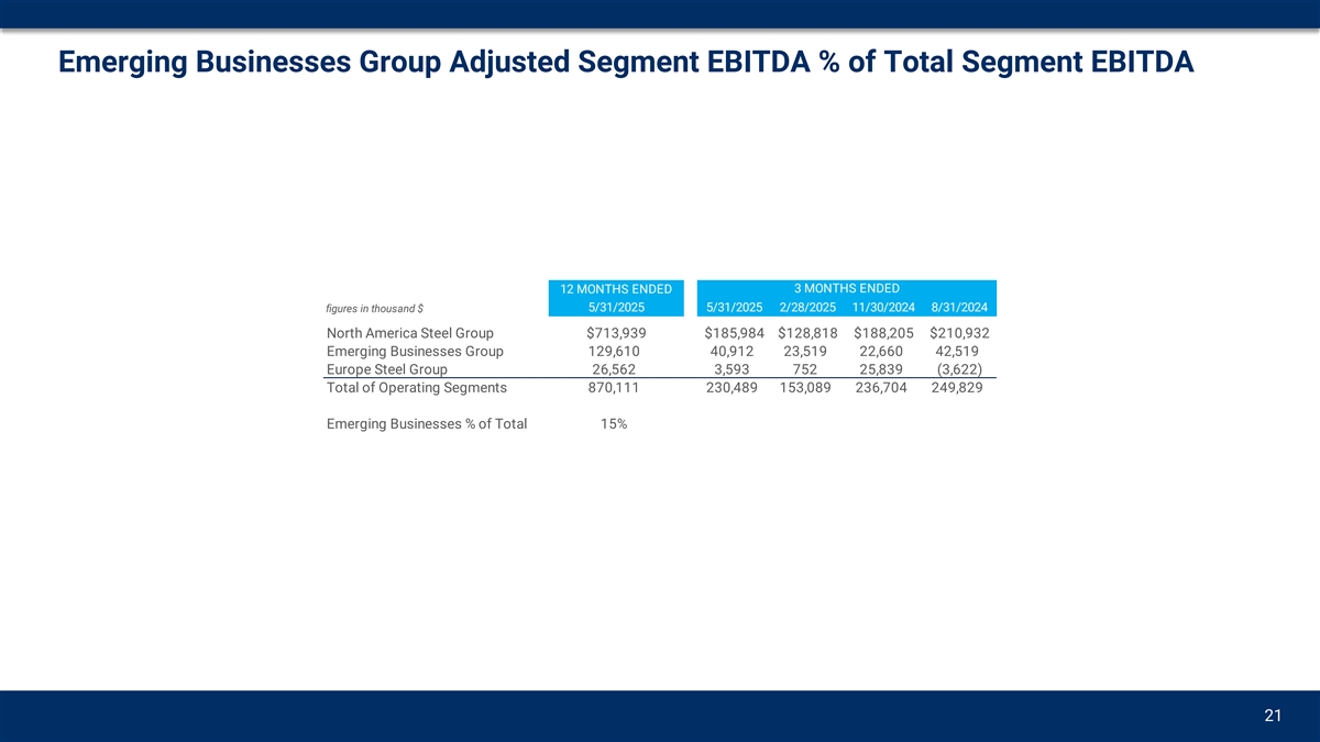 Emerging Businesses Group Adjusted Segment EBITDA % of Total Segment EBITDA 3 MONTHS ENDED 12 MONTHS ENDED figures in thousand $ 5/31/2025 5/31/2025 2/28/2025 11/30/2024 8/31/2024 North America Steel Group $713,939 $185,984 $128,818 $188,205 $210,932 Emerging Businesses Group 129,610 40,912 23,519 22,660 42,519 Europe Steel Group 26,562 3,593 752 25,839 (3,622) Total of Operating Segments 870,111 230,489 153,089 236,704 249,829 Emerging Businesses % of Total 15% 21
