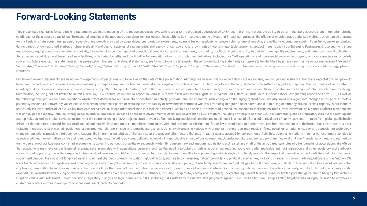 Forward-Looking Statements This presentation contains forward-looking statements within the meaning of the federal securities laws with respect to the proposed acquisition of CP&P and the timing thereof, the ability to obtain regulatory approvals and meet other closing conditions for the proposed acquisition, the expected benefits of the proposed acquisition, general economic conditions, key macro-economic drivers that impact our business, the effects of ongoing trade actions, the effects of continued pressure on the liquidity of our customers, potential synergies and growth provided by acquisitions and strategic investments, demand for our products, shipment volumes, metal margins, the ability to operate our steel mills at full capacity, particularly during periods of domestic mill start-ups, future availability and cost of supplies of raw materials and energy for our operations, growth rates in certain reportable segments, product margins within our Emerging Businesses Group segment, share repurchases, legal proceedings, construction activity, international trade, the impact of geopolitical conditions, capital expenditures, tax credits, our liquidity and our ability to satisfy future liquidity requirements, estimated contractual obligations, the expected capabilities and benefits of new facilities, anticipated benefits and the timeline for execution of our growth plan and initiatives, including our TAG operational and commercial excellence program, and our expectations or beliefs concerning future events. The statements in this presentation that are not historical statements, are forward-looking statements. These forward-looking statements can generally be identified by phrases such as we or our management “expects,” “anticipates,” “believes,” “estimates,” “future,” “intends,” “may,” “plans to,” “ought,” “could,” “will,” “should,” “likely,” “appears,” “projects,” “forecasts,” “outlook” or other similar words or phrases, as well as by discussions of strategy, plans or intentions. Our forward-looking statements are based on management’s expectations and beliefs as of the date of this presentation. Although we believe that our expectations are reasonable, we can give no assurance that these expectations will prove to have been correct, and actual results may vary materially. Except as required by law, we undertake no obligation to update, amend or clarify any forward-looking statements to reflect changed assumptions, the occurrence of anticipated or unanticipated events, new information or circumstances or any other changes. Important factors that could cause actual results to differ materially from our expectations include those described in our filings with the Securities and Exchange Commission, including, but not limited to, in Part I, Item 1A, “Risk Factors” of our annual report on Form 10-K for the fiscal year ended August 31, 2024 and Part II, Item 1A, Risk Factors of our subsequent quarterly reports on Form 10-Q, as well as the following: changes in economic conditions which affect demand for our products or construction activity generally, and the impact of such changes on the highly cyclical steel industry; rapid and significant changes in the price of metals, potentially impairing our inventory values due to declines in commodity prices or reducing the profitability of downstream contracts within our vertically integrated steel operations due to rising commodity pricing; excess capacity in our industry, particularly in China, and product availability from competing steel mills and other steel suppliers including import quantities and pricing; the impact of geopolitical conditions, including political turmoil and volatility, regional conflicts, terrorism and war on the global economy, inflation, energy supplies and raw materials; increased attention to environmental, social and governance (“ESG”) matters, including any targets or other ESG, environmental justice or regulatory initiatives; operating and startup risks, as well as market risks associated with the commissioning of new projects could prevent us from realizing anticipated benefits and could result in a loss of all or a substantial part of our investments; impacts from global public health crises on the economy, demand for our products, global supply chain and on our operations; compliance with and changes in existing and future laws, regulations and other legal requirements and judicial decisions that govern our business, including increased environmental regulations associated with climate change and greenhouse gas emissions; involvement in various environmental matters that may result in fines, penalties or judgments; evolving remediation technology, changing regulations, possible third-party contributions, the inherent uncertainties of the estimation process and other factors that may impact amounts accrued for environmental liabilities; potential limitations in our or our customers' abilities to access credit and non-compliance with their contractual obligations, including payment obligations; activity in repurchasing shares of our common stock under our share repurchase program; financial and non-financial covenants and restrictions on the operation of our business contained in agreements governing our debt; our ability to successfully identify, consummate and integrate acquisitions and realize any or all of the anticipated synergies or other benefits of acquisitions; the effects that acquisitions may have on our financial leverage; risks associated with acquisitions generally, such as the inability to obtain, or delays in obtaining, required approvals under applicable antitrust legislation and other regulatory and third-party consents and approvals; lower than expected future levels of revenues and higher than expected future costs; failure or inability to implement growth strategies in a timely manner; the impact of goodwill or other 
