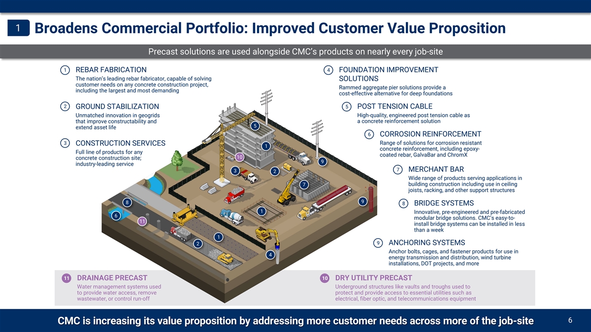 1 Broadens Commercial Portfolio: Improved Customer Value Proposition Precast solutions are used alongside CMC’s products on nearly every job-site 1 4 REBAR FABRICATION FOUNDATION IMPROVEMENT The nation’s leading rebar fabricator, capable of solving SOLUTIONS customer needs on any concrete construction project, Rammed aggregate pier solutions provide a including the largest and most demanding cost-effective alternative for deep foundations 2 5 GROUND STABILIZATION POST TENSION CABLE Unmatched innovation in geogrids High-quality, engineered post tension cable as a concrete reinforcement solution that improve constructability and 5 extend asset life 6 CORROSION REINFORCEMENT 3 Range of solutions for corrosion resistant CONSTRUCTION SERVICES 1 concrete reinforcement, including epoxy- Full line of products for any coated rebar, GalvaBar and ChromX 10 concrete construction site; 9 industry-leading service 7 MERCHANT BAR 3 2 Wide range of products serving applications in 7 building construction including use in ceiling joists, racking, and other support structures 9 8 8 BRIDGE SYSTEMS 1 Innovative, pre-engineered and pre-fabricated 6 modular bridge solutions. CMC’s easy-to- 11 install bridge systems can be installed in less than a week 1 9 2 ANCHORING SYSTEMS Anchor bolts, cages, and fastener products for use in 4 energy transmission and distribution, wind turbine installations, DOT projects, and more 11 10 DRAINAGE PRECAST DRY UTILITY PRECAST Water management systems used Underground structures like vaults and troughs used to to provide water access, remove protect and provide access to essential utilities such as wastewater, or control run-off electrical, fiber optic, and telecommunications equipment CMC Acquires X 6 CMC is increasing its value proposition by addressing more customer needs across more of the job-site