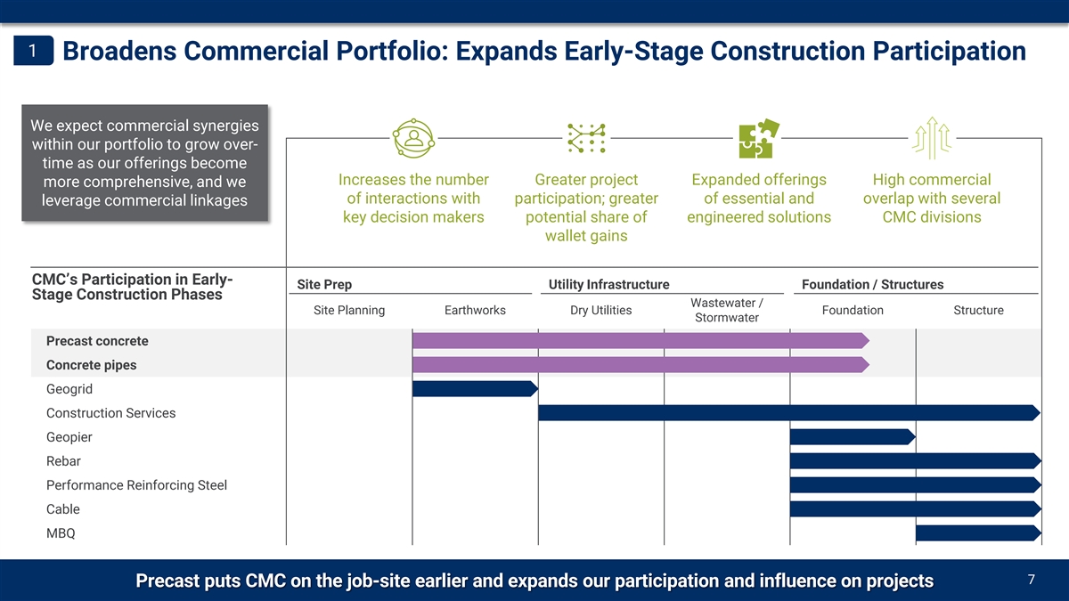 | • | Broadens CMC portfolio of early-stage construction solutions: Precast capabilities will expand CMC’s commercial portfolio of value-added early-stage construction solutions with targeted customer groups and bring CMC onto the construction site earlier in the life of a project. The addition of these solutions meaningfully enhances CMC’s ability to participate in construction activity from site preparation to structural erection. |