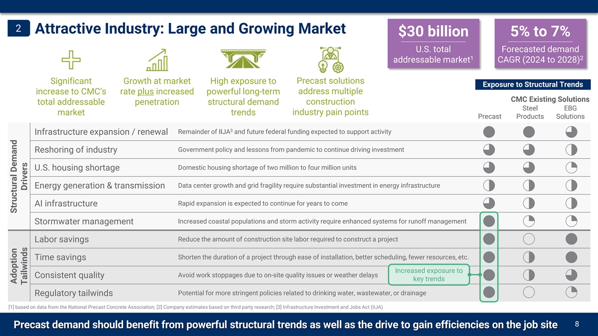 2 Attractive Industry: Large and Growing Market $30 billion 5% to 7% U.S. total Forecasted demand 1 2 addressable market CAGR (2024 to 2028) Significant Growth at market High exposure to Precast solutions Exposure to Structural Trends address multiple increase to CMC’s rate plus increased powerful long-term CMC Existing Solutions construction total addressable penetration structural demand Steel EBG market trends industry pain points Precast Products Solutions 3 Remainder of IIJA and future federal funding expected to support activity Infrastructure expansion / renewal Government policy and lessons from pandemic to continue driving investment Reshoring of industry Domestic housing shortage of two million to four million units U.S. housing shortage Data center growth and grid fragility require substantial investment in energy infrastructure Energy generation & transmission Rapid expansion is expected to continue for years to come AI infrastructure Increased coastal populations and storm activity require enhanced systems for runoff management Stormwater management Reduce the amount of construction site labor required to construct a project Labor savings Shorten the duration of a project through ease of installation, better scheduling, fewer resources, etc. Time savings Increased exposure to Avoid work stoppages due to on-site quality issues or weather delays Consistent quality key trends Potential for more stringent policies related to drinking water, wastewater, or drainage Regulatory tailwinds [1] based on data from the National Precast Concrete Association; [2] Company estimates based on third party research; [3] Infrastructure Investment and Jobs Act (IIJA) CMC Acquires X 8 Precast demand should benefit from powerful structural trends as well as the drive to gain efficiencies on the job site Adoption Structural Demand Tailwinds Drivers