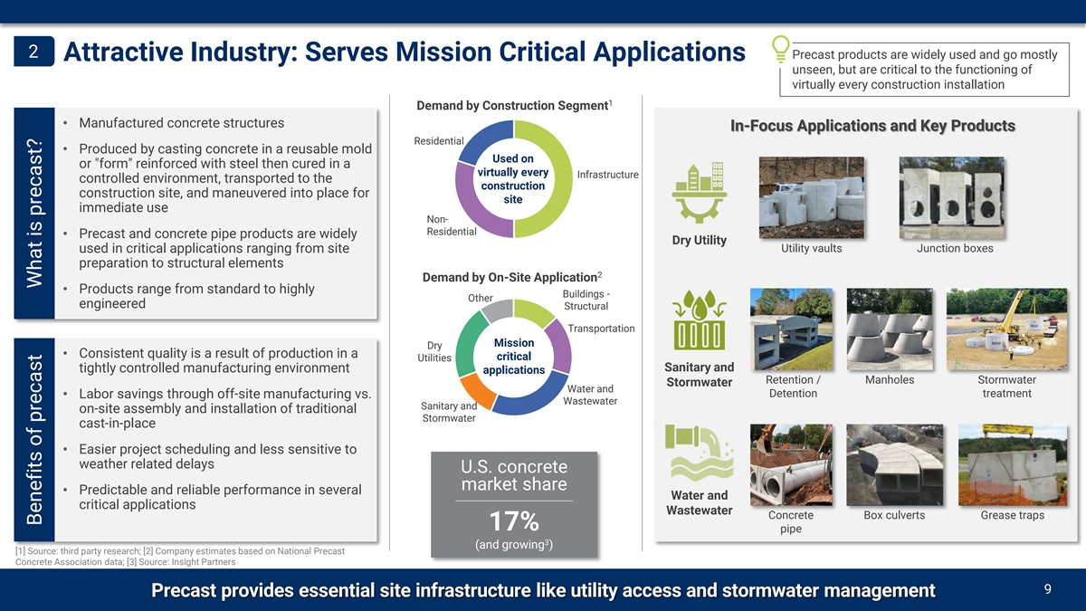 | • | Entry into a large and attractive industry: The domestic precast concrete industry generates approximately $30 billion of revenue annually. Market growth is projected to outpace the broader concrete sector, driven by positive adoption trends toward labor and time saving capabilities that precast solutions offer. EBITDA margins generally exceed 20% and are reinforced by the value-added and engineered characteristics of the products. |