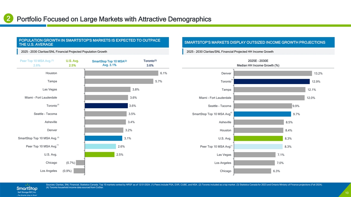 /Admin/ADVANCED GRAPHICS FILES/Cover and Template/2024/2024_01/4159141-001_Trevor McMillin_SmartStop_Cover & Template C O N F I D E N T I A L COLOR PALETTE Text 2 Portfolio Focused on Large Markets with Attractive Demographics 50 56 62 Title bar/Bullets 1 124 186 ACCENTS POPULATION GROWTH IN SMARTSTOP’S MARKETS IS EXPECTED TO OUTPACE SMARTSTOP’S MARKETS DISPLAY OUTSIZED INCOME GROWTH PROJECTIONS 1 126 THE U.S. AVERAGE 124 211 1 186 254 2025 – 2030 Claritas/SNL Financial Projected Population Growth 2025 – 2030 Claritas/SNL Financial Projected HH Income Growth 127 212 188 253 2 (1) (3) (2) 2025E – 2030E 3 129 Peer Top 10 MSA Avg. U.S. Avg. Toronto SmartStop Top 10 MSA Avg. 3.1% 2.6% 2.5% 3.6% Median HH Income Growth (%) 32 140 56 168 3 100 218 Houston 6.1% Denver 13.2% 0 141 (4) 157 220 4 Tampa 5.7% Toronto 12.9% 226 255 166 219 Las Vegas 3.8% Tampa 12.1% 166 219 5 166 219 Miami - Fort Lauderdale 3.6% Miami - Fort Lauderdale 12.0% 1 126 Hyperlink 124 211 186 254 (3) Toronto 3.6% Seattle - Tacoma 9.9% 127 212 Followed 188 253 (2) Hyperlink Seattle - Tacoma 3.5% SmartStop Top 10 MSA Avg. 9.7% 3 129 TABLE Asheville 3.4% Asheville 8.5% 50 56 Lines Denver 3.2% Houston 8.4% 62 1 (2) SmartStop Top 10 MSA Avg. 3.1% U.S. Avg. 8.3% 124 Highlights 186 (1) (1) Peer Top 10 MSA Avg. 2.6% Peer Top 10 MSA Avg. 8.3% U.S. Avg. 2.5% Las Vegas 7.1% Chicago (0.7%) Los Angeles 7.0% Los Angeles (0.9%) Chicago 6.3% Sources: Claritas, SNL Financial, Statistics Canada. Top 10 markets ranked by NRSF as of 12/31/2024. (1) Peers include PSA, EXR, CUBE, and NSA. (2) Toronto included as a top market. (3) Statistics Canada for 2023 and Ontario Ministry of Finance projections (Fall 2024). (4) Toronto household income data sourced from CoStar. 10