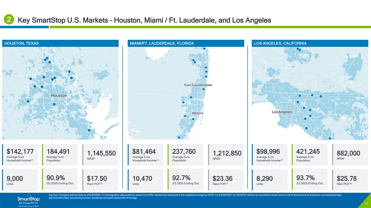 /Admin/ADVANCED GRAPHICS FILES/Cover and Template/2024/2024_01/4159141-001_Trevor McMillin_SmartStop_Cover & Template C O N F I D E N T I A L COLOR PALETTE Text 2 Key SmartStop U.S. Markets – Houston, Miami / Ft. Lauderdale, and Los Angeles 50 56 62 Title bar/Bullets 1 124 186 ACCENTS HOUSTON, TEXAS MIAMI/FT. LAUDERDALE, FLORIDA LOS ANGELES, CALIFORNIA 1 126 *P *PL LE EA AS SE E D DO O N NOT OT D DE EL LE ET TE E 124 211 1 186 254 T TH HIIS S T TE EX XT T B BO OX X* * 127 212 188 253 2 T This his map map w was as created created 3 129 us usiing ng A ArcG rcGIIS S P Pro. ro. 32 140 T Thi his s ttag ag iide dentif ntifiies es tthe he m map ap 56 168 3 al alllow owiing ng ad addi dittiion onal al up upda da 100 ttes es 218 an and d ed ediitts s usi using ng prev previiou ousl sly y 0 141 sub subm miitttted ed m mater ateriial als s an and dat d dat 157 a. a. 220 4 226 255 C Con onttact act G GC CFO FO- -P Pr rese esentat ntatiion ons s an and d use use tthe he w work orkffllow ow 166 219 166 219 r ref eference erence nu num mbe ber r be bellow ow tto o 5 166 219 m mak ake e ed ediitts. s. 1 126 A ArcG rcGIIS S P Pro ro Hyperlink 124 211 W Workf orkfllow ow r ref eference erence nu num mbe ber r 186 254 iis: s: 42 4209 0909 095 5- -003 003 127 212 Followed 188 253 Hyperlink 3 129 TABLE 50 56 Lines 62 1 124 Highlights 186 $142,177 184,491 $81,464 237,760 $98,996 421,245 1,145,550 1,212,850 882,000 Average 5-mi Average 5-mi Average 5-mi Average 5-mi Average 5-mi Average 5-mi NRSF NRSF NRSF (1) (1) (1) Household Income Population Household Income Population Household Income Population 90.9% 92.7% 93.7% 9,000 $17.50 10,470 $23.36 8,290 $25.78 2Q 2025 Ending Occ. (2) 2Q 2025 Ending Occ. (2) 2Q 2025 Ending Occ. (2) Units Rent POF Units Rent POF Units Rent POF Sources: Company internal data as of 6/30/2025. (1) Demographic data pulled by asset from ESRI; market data displayed is the weighted average by NRSF as of 6/30/2025. (2) RentPOF defined as annualized rental revenue net of discounts & concessions, excluding late fees, administrative fees and parking income, divided by occupied square feet of storage. 11