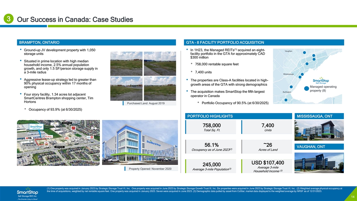 /Admin/ADVANCED GRAPHICS FILES/Cover and Template/2024/2024_01/4159141-001_Trevor McMillin_SmartStop_Cover & Template C O N F I D E N T I A L COLOR PALETTE Text 3 Our Success in Canada: Case Studies 50 56 62 Title bar/Bullets 1 124 186 ACCENTS BRAMPTON, ONTARIO GTA – 8 FACILITY PORTFOLIO ACQUISITION 1 126 *PLEASE DO NOT DELETE 124 211 1 (1) • Ground-up JV development property with 1,050 • In 1H23, the Managed REITs acquired an eight- Vaughan 186 254 THIS TEXT BOX* storage units facility portfolio in the GTA for approximately CAD 127 212 $300 million 188 253 2 • Situated in prime location with high median This map was created 3 129 • 758,000 rentable square feet household income, 2.5% annual population using ArcGIS Pro. 32 140 growth, and only 1.5 SF/person storage supply in This tag identifies the map 56 168 3 • 7,400 units a 3-mile radius allowing additional upda 100 tes 218 Mississauga and edits using previously 0 141 • Aggressive lease-up strategy led to greater than • The properties are Class-A facilities located in high- submitted materials and dat 157 a. 220 4 90% physical occupancy within 17 months of 226 255 growth areas of the GTA with strong demographics Contact GCFO-Presentations Managed operating opening and use the workflow 166 219 property (8) • The acquisition makes SmartStop the fifth largest Burlington 166 219 reference number below to 5 • Four story facility, 1.34 acres lot adjacent 166 219 operator in Canada make edits. SmartCentres Brampton shopping center, Tim 1 126 ArcGIS Pro Hortons Purchased Land: August 2019• Portfolio Occupancy of 90.5% (at 6/30/2025) Hyperlink 124 211 Workflow reference number 186 254 is: 4209095-003 • Occupancy of 93.9% (at 6/30/2025) 127 212 Followed 188 253 Hyperlink PORTFOLIO HIGHLIGHTS MISSISSAUGA, ONT 3 129 TABLE 758,000 7,400 50 Total Sq. Ft. Units 56 Lines 62 1 124 Highlights 186 56.1% ~26 VAUGHAN, ONT (2) Occupancy as of June 2023 Acres of Land USD $107,400 245,000 Average 3-mile (3) Property Opened: November 2020 Average 3-mile Population (3) Household Income (1) One property was acquired in January 2023 by Strategic Storage Trust VI, Inc. One property was acquired in June 2023 by Strategic Storage Growth Trust III, Inc. Six properties were acquired in June 2023 by Strategic Storage Trust VI, Inc.. (2) Weighted average physical occupancy at the time of acquisitions, weighted by net rentable square feet. One property was acquired in January 2023. Seven were acquired in June 2023. (3) Demographic data pulled by asset from CoStar; market data displayed is the weighted average by NRSF as of 12/31/2023. 14