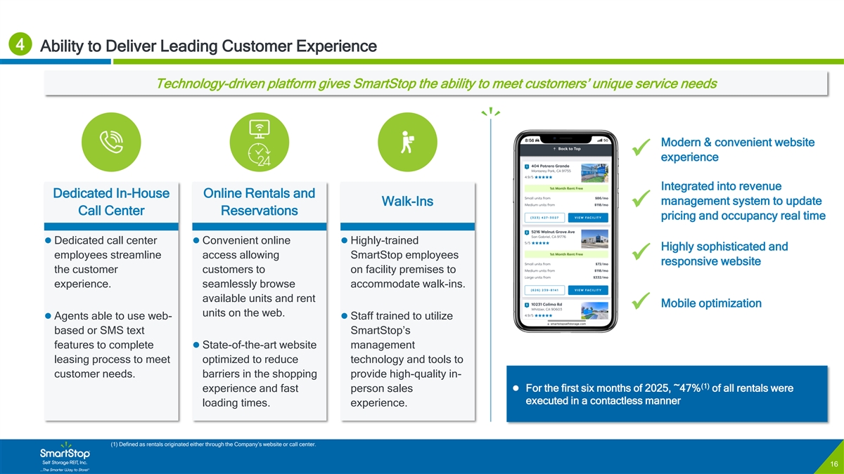 /Admin/ADVANCED GRAPHICS FILES/Cover and Template/2024/2024_01/4159141-001_Trevor McMillin_SmartStop_Cover & Template C O N F I D E N T I A L COLOR PALETTE Text 4 Ability to Deliver Leading Customer Experience 50 56 62 Title bar/Bullets 1 124 186 Technology-driven platform gives SmartStop the ability to meet customers’ unique service needs ACCENTS 1 126 124 211 1 186 254 127 212 188 253 2 Modern & convenient website 3 129 ✓ experience 32 140 56 168 3 100 218 0 141 Integrated into revenue 157 220 4 Dedicated In-House Online Rentals and 226 255 management system to update Walk-Ins ✓ 166 219 Call Center Reservations pricing and occupancy real time 166 219 5 166 219 1 126 ⚫ Dedicated call center ⚫ Convenient online ⚫ Highly-trained Hyperlink 124 211 Highly sophisticated and 186 254 employees streamline access allowing SmartStop employees ✓ 127 212 responsive website Followed 188 253 the customer customers to on facility premises to Hyperlink 3 129 experience. seamlessly browse accommodate walk-ins. TABLE available units and rent 50 Mobile optimization 56 Lines ✓ units on the web. 62 ⚫ Agents able to use web-⚫ Staff trained to utilize 1 based or SMS text SmartStop’s 124 Highlights 186 features to complete ⚫ State-of-the-art website management leasing process to meet optimized to reduce technology and tools to customer needs. barriers in the shopping provide high-quality in- (1) ⚫ For the first six months of 2025, ~47% of all rentals were experience and fast person sales executed in a contactless manner loading times. experience. (1) Defined as rentals originated either through the Company’s website or call center. 16