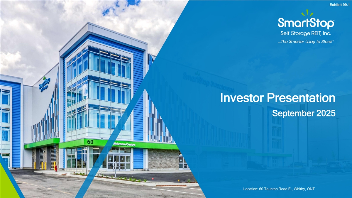 /Admin/ADVANCED GRAPHICS FILES/Cover and Template/2024/2024_01/4159141-001_Trevor McMillin_SmartStop_Cover & Template C O N F I D E N T I A L COLOR PALETTE Text Disclaimer & Forward-Looking Disclosure 50 56 62 Title bar/Bullets Certain of the matters discussed in this investor presentation, other than historical facts, constitute forward-looking statements within the meaning of the federal securities laws, and we intend for all such forward-looking statements to be covered by the applicable safe harbor 1 124 186 provisions for forward-looking statements contained in such federal securities laws. Such forward-looking statements can generally be identified by our use of forward-looking terminology such as “may,” “will,” “expect,” “intend,” “anticipate,” “estimate,” “believe,” “continue,” or other similar words, or the negative of such terms or other comparable terminology, or by discussions of strategy or the outlook for Argus Professional Storage Management, LLC (“Argus”)’s, SmartStop’s or the combined company’s future businesses and financial performance and/or the ACCENTS performance of the self-storage industry and economy in general. All such subsequent forward-looking statements, whether written or oral, by us or on our behalf, are also expressly qualified by these cautionary statements. Such statements include, but are not limited to statements concerning our plans, strategies, initiatives, prospects, objectives, goals, future events, future revenues or performance, capital expenditures, financing needs, plans or intentions relating to acquisitions (including the pending acquisition of Argus and its potential effects upon 1 126 SmartStop) and other information that is not historical information. Such statements are subject to known and unknown risks and uncertainties, which could cause actual results to differ materially from those projected or anticipated, including, without limitation: 124 211 1 186 254 • disruptions in the economy, including debt and banking markets and foreign currency, including changes in the Canadian Dollar ( CAD )/U.S. Dollar ( USD ) exchange rate; 127 212 188 253 2 • significant transaction costs, including financing costs, and unknown liabilities; 3 129 • whether we will be successful in the pursuit of our business plan and investment objectives; 32 140 56 168 3 • changes in the political and economic climate, economic conditions and fiscal imbalances in the United States, and other major developments, including tariffs, wars, natural disasters, epidemics and pandemics, military actions, and terrorist attacks; 100 218 • changes in tax and other laws and regulations, including tenant protection programs and other aspects of our business; 0 141 157 220 4 • difficulties in our ability to attract and retain qualified personnel and management; 226 255 166 219 • conflicts of interest relating to the purchase of properties, including conflicts with the Managed REITs—such conflicts may not be resolved in our favor, which could adversely affect our investment opportunities; 166 219 5 166 219 • the effect of competition at our self-storage properties or from other storage alternatives, which could cause rents and occupancy rates to decline; 1 126 • failure to close on pending or future acquisitions (including the potential Argus transaction) on favorable terms or at all; Hyperlink 124 211 186 254 • the risk that the cost savings and synergies from proposed acquisitions may not be fully or timely realized, that proposed acquisitions may be disruptive to our businesses and that integration of acquisitions will be materially delayed or will be more costly or difficult than expected, as 127 212 well as potential reputational risk associated with potential acquisitions and the reaction of each company’s customers, suppliers, employees or other business partners Followed 188 253 Hyperlink 3 129 • our reliance on information technologies, which are vulnerable to, among other things, attack from computer viruses and malware, hacking, cyberattacks and other unauthorized access or misuse; TABLE • increases in interest rates; and 50 • failure to maintain our REIT status. 56 Lines 62 All forward-looking statements, including without limitation, management’s examination of historical operating trends and estimates of future earnings, are based upon our current expectations and various assumptions. Our expectations, beliefs and projections are expressed in good faith, and we believe there is a reasonable basis for them, but there can be no assurance that management’s expectations, beliefs and projections will result or be achieved. Readers are cautioned not to place undue reliance on these forward-looking statements, which speak only as 1 of the date of this presentation and are not intended to be a guarantee of our performance in future periods. We cannot guarantee the accuracy of any such forward-looking statements contained in this investor presentation, and we do not intend to publicly update or revise any 124 Highlights forward-looking statements, whether as a result of new information, future events, or otherwise. For further information regarding risks and uncertainties associated with our business, and important factors that could cause our actual results to vary materially from those expressed or 186 implied in such forward-looking statements, please refer to the factors listed and described under “Management’s Discussion and Analysis of Financial Condition and Results of Operations” and the “Risk Factors” sections of the documents we file from time to time with the Securities and Exchange Commission (the “SEC”), including, but not limited to, our Annual Report on Form 10-K for the year ended December 31, 2024, and our Quarterly Report on Form 10-Q for the quarter ended June 30, 2025, copies of which may be obtained from our website at investors.smartstopselfstorage.com. We use mark