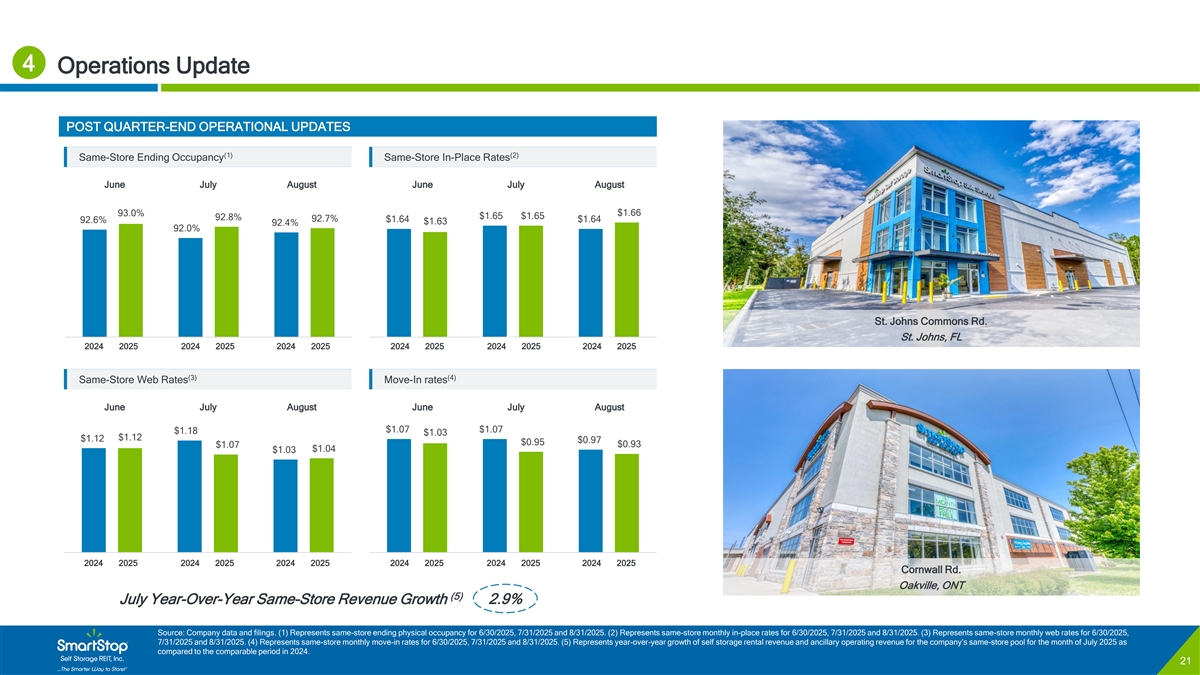 /Admin/ADVANCED GRAPHICS FILES/Cover and Template/2024/2024_01/4159141-001_Trevor McMillin_SmartStop_Cover & Template C O N F I D E N T I A L COLOR PALETTE Text 4 Operations Update 50 56 62 Title bar/Bullets 1 124 186 POST QUARTER-END OPERATIONAL UPDATES ACCENTS 1 126 (1) (2) Same-Store Ending Occupancy Same-Store In-Place Rates 124 211 1 186 254 June July August June July August 127 212 188 253 2 3 129 $1.66 93.0% $1.65 $1.65 92.8% 92.7% $1.64 $1.64 92.6% $1.63 92.4% 32 140 92.0% 56 168 3 100 218 0 141 157 220 4 226 255 166 219 166 219 5 166 219 St. Johns Commons Rd. St. Johns, FL 1 126 2024 2025 2024 2025 2024 2025 2024 2025 2024 2025 2024 2025 Hyperlink 124 211 June July August June July August 186 254 127 212 (3) (4) Followed Same-Store Web Rates Move-In rates 188 253 Hyperlink 3 129 June July August June July August TABLE 50 $1.07 $1.07 $1.18 $1.03 $1.12 56 $1.12 Lines $0.97 $0.95 $0.93 $1.07 62 $1.04 $1.03 1 124 Highlights 186 2024 2025 2024 2025 2024 2025 2024 2025 2024 2025 2024 2025 June July August June July August Cornwall Rd. Oakville, ONT (5) July Year-Over-Year Same-Store Revenue Growth 2.9% Source: Company data and filings. (1) Represents same-store ending physical occupancy for 6/30/2025, 7/31/2025 and 8/31/2025. (2) Represents same-store monthly in-place rates for 6/30/2025, 7/31/2025 and 8/31/2025. (3) Represents same-store monthly web rates for 6/30/2025, 7/31/2025 and 8/31/2025. (4) Represents same-store monthly move-in rates for 6/30/2025, 7/31/2025 and 8/31/2025. (5) Represents year-over-year growth of self storage rental revenue and ancillary operating revenue for the company’s same-store pool for the month of July 2025 as compared to the comparable period in 2024. 21