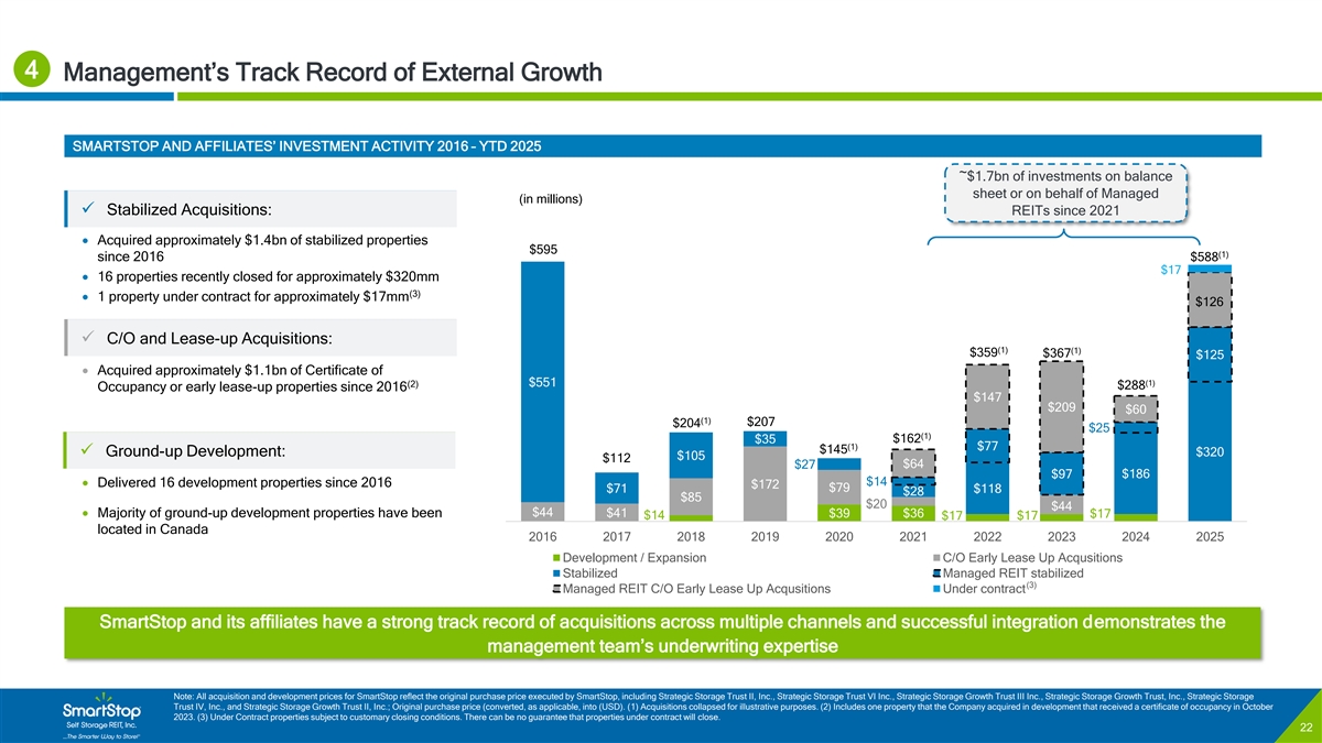 /Admin/ADVANCED GRAPHICS FILES/Cover and Template/2024/2024_01/4159141-001_Trevor McMillin_SmartStop_Cover & Template C O N F I D E N T I A L COLOR PALETTE Text 4 Management’s Track Record of External Growth 50 56 62 Title bar/Bullets 1 124 186 SMARTSTOP AND AFFILIATES’ INVESTMENT ACTIVITY 2016 – YTD 2025 ACCENTS 1 126 ~$1.7bn of investments on balance 124 211 1 186 254 sheet or on behalf of Managed (in millions) (3) 127 212 ✓ Stabilized Acquisitions: REITs since 2021 188 253 2 3 129 (3) • Acquired approximately $1.4bn of stabilized properties $595 32 140 (1) since 2016 $588 56 168 3 $17 100 218 • 16 properties recently closed for approximately $320mm 0 141 (3) • 1 property under contract for approximately $17mm 157 220 $126 4 226 255 166 219 ✓ C/O and Lease-up Acquisitions: 166 219 5 (1) (1) 166 219 $359 $367 $125 • Acquired approximately $1.1bn of Certificate of 1 126 Hyperlink 124 211 $551 (1) (2) $288 Occupancy or early lease-up properties since 2016 186 254 $147 $209 $60 127 212 Followed (1) 188 253 $207 $204 $25 Hyperlink 3 129 (1) $162 $35 (1) $77 $145 ✓ Ground-up Development: $320 TABLE $105 $112 $64 $27 50 $97 $186 56 $14 Lines• Delivered 16 development properties since 2016 $172 $79 $71 $118 $28 62 $85 $20 $44 • Majority of ground-up development properties have been $44 $41 $36 $39 $17 $14 $17 1 $17 124 Highlights located in Canada 2016 2017 2018 2019 2020 2021 2022 2023 2024 2025 186 Development / Expansion C/O Early Lease Up Acqusitions Stabilized Managed REIT stabilized (3) Managed REIT C/O Early Lease Up Acqusitions Under contract SmartStop and its affiliates have a strong track record of acquisitions across multiple channels and successful integration demonstrates the management team’s underwriting expertise Note: All acquisition and development prices for SmartStop reflect the original purchase price executed by SmartStop, including Strategic Storage Trust II, Inc., Strategic Storage Trust VI Inc., Strategic Storage Growth Trust III Inc., Strategic Storage Growth Trust, Inc., Strategic Storage Trust IV, Inc., and Strategic Storage Growth Trust II, Inc.; Original purchase price (converted, as applicable, into (USD). (1) Acquisitions collapsed for illustrative purposes. (2) Includes one property that the Company acquired in development that received a certificate of occupancy in October 2023. (3) Under Contract properties subject to customary closing conditions. There can be no guarantee that properties under contract will close. 22