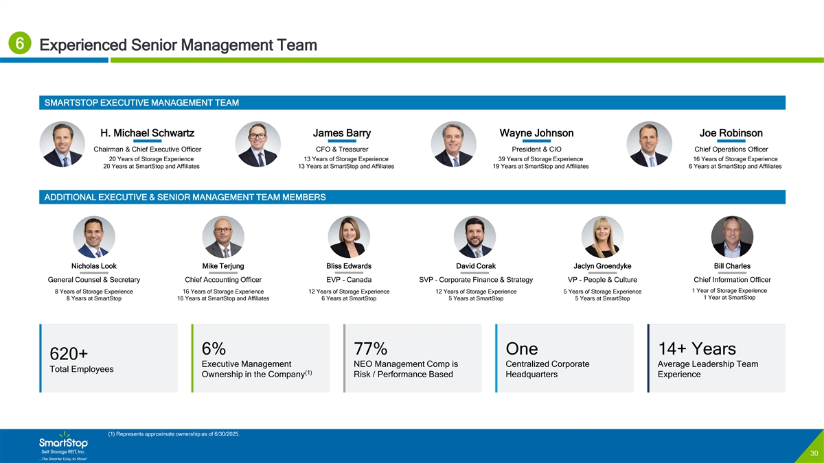 /Admin/ADVANCED GRAPHICS FILES/Cover and Template/2024/2024_01/4159141-001_Trevor McMillin_SmartStop_Cover & Template C O N F I D E N T I A L COLOR PALETTE Text 6 Experienced Senior Management Team 50 56 62 Title bar/Bullets 1 124 186 ACCENTS SMARTSTOP EXECUTIVE MANAGEMENT TEAM 1 126 124 211 1 186 254 127 212 H. Michael Schwartz James Barry Wayne Johnson Joe Robinson 188 253 2 3 129 Chairman & Chief Executive Officer CFO & Treasurer President & CIO Chief Operations Officer 32 140 20 Years of Storage Experience 13 Years of Storage Experience 39 Years of Storage Experience 16 Years of Storage Experience 56 168 3 20 Years at SmartStop and Affiliates 13 Years at SmartStop and Affiliates 19 Years at SmartStop and Affiliates 6 Years at SmartStop and Affiliates 100 218 0 141 157 220 4 226 255 ADDITIONAL EXECUTIVE & SENIOR MANAGEMENT TEAM MEMBERS 166 219 166 219 5 166 219 1 126 Hyperlink 124 211 186 254 127 212 Followed 188 253 Nicholas Look Mike Terjung Bliss Edwards David Corak Jaclyn Groendyke Bill Charles Hyperlink 3 129 General Counsel & Secretary Chief Accounting Officer EVP - Canada SVP – Corporate Finance & Strategy VP - People & Culture Chief Information Officer TABLE 1 Year of Storage Experience 8 Years of Storage Experience 16 Years of Storage Experience 12 Years of Storage Experience 12 Years of Storage Experience 5 Years of Storage Experience 50 1 Year at SmartStop 8 Years at SmartStop 16 Years at SmartStop and Affiliates 6 Years at SmartStop 5 Years at SmartStop 5 Years at SmartStop 56 Lines 62 1 124 Highlights 186 6% 77% One 14+ Years 620+ Executive Management NEO Management Comp is Centralized Corporate Average Leadership Team Total Employees (1) Ownership in the Company Risk / Performance Based Headquarters Experience (1) Represents approximate ownership as of 6/30/2025. 30