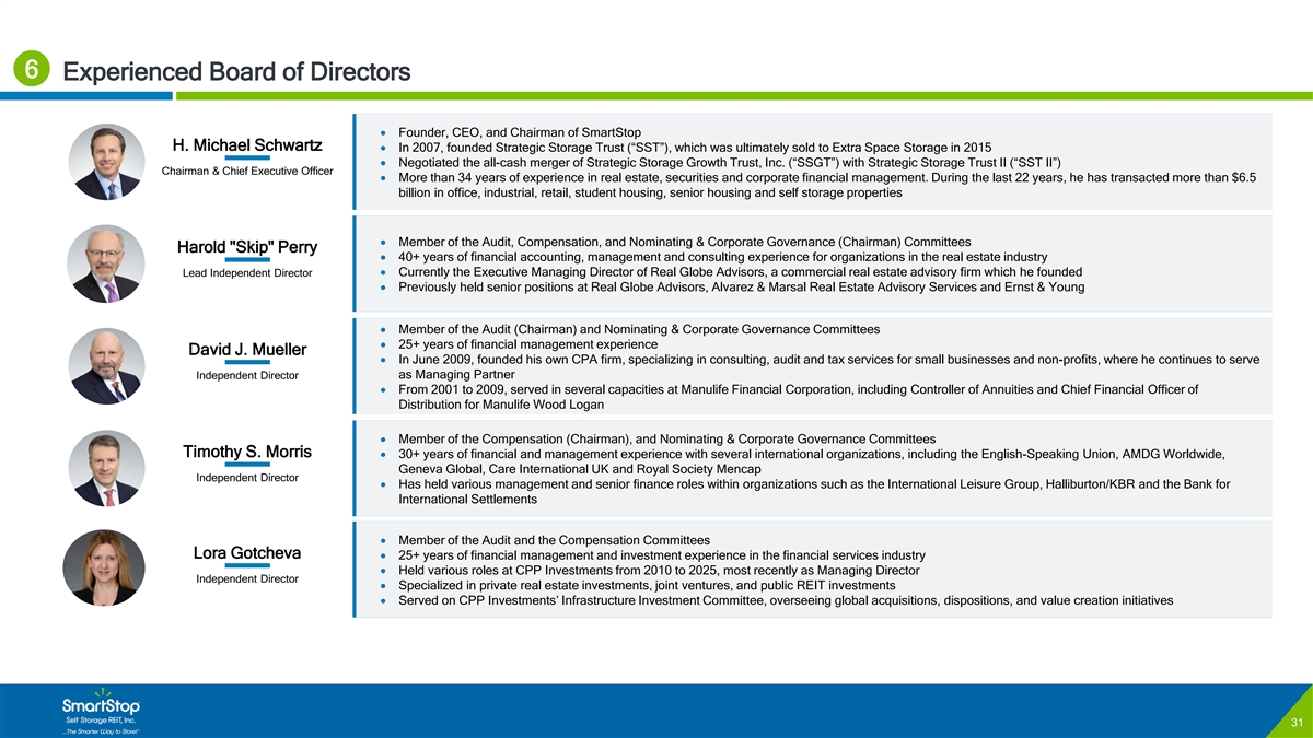 /Admin/ADVANCED GRAPHICS FILES/Cover and Template/2024/2024_01/4159141-001_Trevor McMillin_SmartStop_Cover & Template C O N F I D E N T I A L COLOR PALETTE Text 6 Experienced Board of Directors 50 56 62 Title bar/Bullets 1 124 186 • Founder, CEO, and Chairman of SmartStop H. Michael Schwartz • In 2007, founded Strategic Storage Trust (“SST”), which was ultimately sold to Extra Space Storage in 2015 ACCENTS • Negotiated the all-cash merger of Strategic Storage Growth Trust, Inc. (“SSGT”) with Strategic Storage Trust II (“SST II”) 1 126 Chairman & Chief Executive Officer 124 211 • More than 34 years of experience in real estate, securities and corporate financial management. During the last 22 years, he has transacted more than $6.5 1 186 254 billion in office, industrial, retail, student housing, senior housing and self storage properties 127 212 188 253 2 3 129 • Member of the Audit, Compensation, and Nominating & Corporate Governance (Chairman) Committees 32 140 Harold Skip Perry Harold Skip Perry • 40+ years of financial accounting, management and consulting experience for organizations in the real estate industry 56 168 3 100 218 In Led ad e p Ine dn ep de e nn dt en Dir t Di ercto ectorr• Currently the Executive Managing Director of Real Globe Advisors, a commercial real estate advisory firm which he founded • Previously held senior positions at Real Globe Advisors, Alvarez & Marsal Real Estate Advisory Services and Ernst & Young 0 141 157 220 4 226 255 166 219• Member of the Audit (Chairman) and Nominating & Corporate Governance Committees 166 219 5 • 25+ years of financial management experience 166 219 David J. Mueller • In June 2009, founded his own CPA firm, specializing in consulting, audit and tax services for small businesses and non-profits, where he continues to serve David J. Mueller 1 126 Independent Director as Managing Partner Hyperlink 124 211 Independent Director 186 254• From 2001 to 2009, served in several capacities at Manulife Financial Corporation, including Controller of Annuities and Chief Financial Officer of Distribution for Manulife Wood Logan 127 212 Followed 188 253 Hyperlink 3 129 • Member of the Compensation (Chairman), and Nominating & Corporate Governance Committees TABLE Timothy S. Morris • 30+ years of financial and management experience with several international organizations, including the English-Speaking Union, AMDG Worldwide, 50 Geneva Global, Care International UK and Royal Society Mencap Independent Director 56 Lines • Has held various management and senior finance roles within organizations such as the International Leisure Group, Halliburton/KBR and the Bank for 62 International Settlements 1 124 Highlights 186 • Member of the Audit and the Compensation Committees Lora Gotcheva • 25+ years of financial management and investment experience in the financial services industry Paula Mathews • Held various roles at CPP Investments from 2010 to 2025, most recently as Managing Director Independent Director Director• Specialized in private real estate investments, joint ventures, and public REIT investments • Served on CPP Investments’ Infrastructure Investment Committee, overseeing global acquisitions, dispositions, and value creation initiatives 31