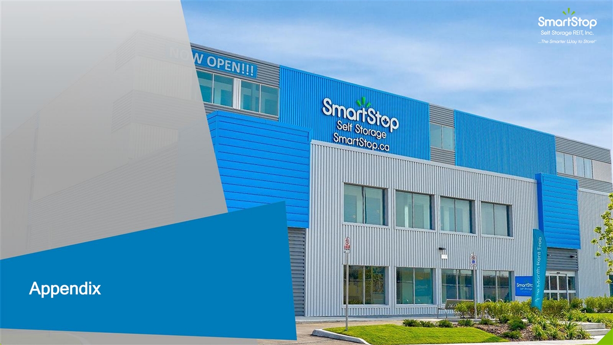 /Admin/ADVANCED GRAPHICS FILES/Cover and Template/2024/2024_01/4159141-001_Trevor McMillin_SmartStop_Cover & Template C O N F I D E N T I A L COLOR PALETTE Text 4 Strong Track Record of Internal Growth 50 56 62 Title bar/Bullets SmartStop’s internal growth strategies have translated into successful long-term growth 1 124 186 ACCENTS 1 126 124 211 1 186 254 HISTORY OF OPERATIONAL EXCELLENCE HIGHLIGHTED BY SAME-STORE PERFORMANCE VS. PEERS EMBEDDED NOI UPSIDE FROM NON SAME-STORE ASSETS 127 212 188 253 2 3 129 (5) 2Q 2025 Ending Non Same-Store vs. Same-Store Occupancy 2Q’25 Same-Store Revenue Growth 2Q’25 Same-Store NOI Growth 32 140 56 168 3 100 218 SmartStop Peer avg. Delta SmartStop Peer avg. Delta 0 141 2Q’25 0.4% (0.8%) +123bps 2Q’25 (1.1%) (2.7%) +163bps 157 220 4 +3.3% 93.0% 226 255 166 219 166 219 5 166 219 (1) (2) (3) 3-year Avg. YoY Same-Store NOI Growth 3-year Avg. YoY Same-Store Revenue Growth 1 126 Hyperlink 124 211 186 254 89.7% 127 212 3.8% Followed 3.7% 188 253 3.5% Hyperlink 3.4% 3 129 2.8% 2.6% 2.7% TABLE 2.4% 50 56 Lines 62 0.8% 1 124 Highlights 186 PSA SMA EXR CUBE NSA (0.5%) Non Same-Store Same-Store (4) (4) Non same-store pool includes 22 properties covering ~1.9mm square feet (14% of total square feet) Sources: Public company filings and financial supplements. Note: peers may have different definitions of same-store metrics. (1) Represents the simple average of quarterly year-over-year same-store revenue growth for the most recent 12 quarters (the quarter ended 09/30/2022 through 6/30/2025). (2) Represents the simple average of quarterly year-over-year same-store NOI growth for the most recent 12 quarters (the quarter ended 09/30/2022 through 6/30/2025). (3) Same-Store NOI is a non-GAAP measure. See Appendix for a reconciliation of this measure to the most directly comparable GAAP measure. (4) Excludes impact of LSI transaction and reflects EXR SS Pool Only. (5) Represents 6/30/2025 non same-store and same-store ending physical occupancy. 19
