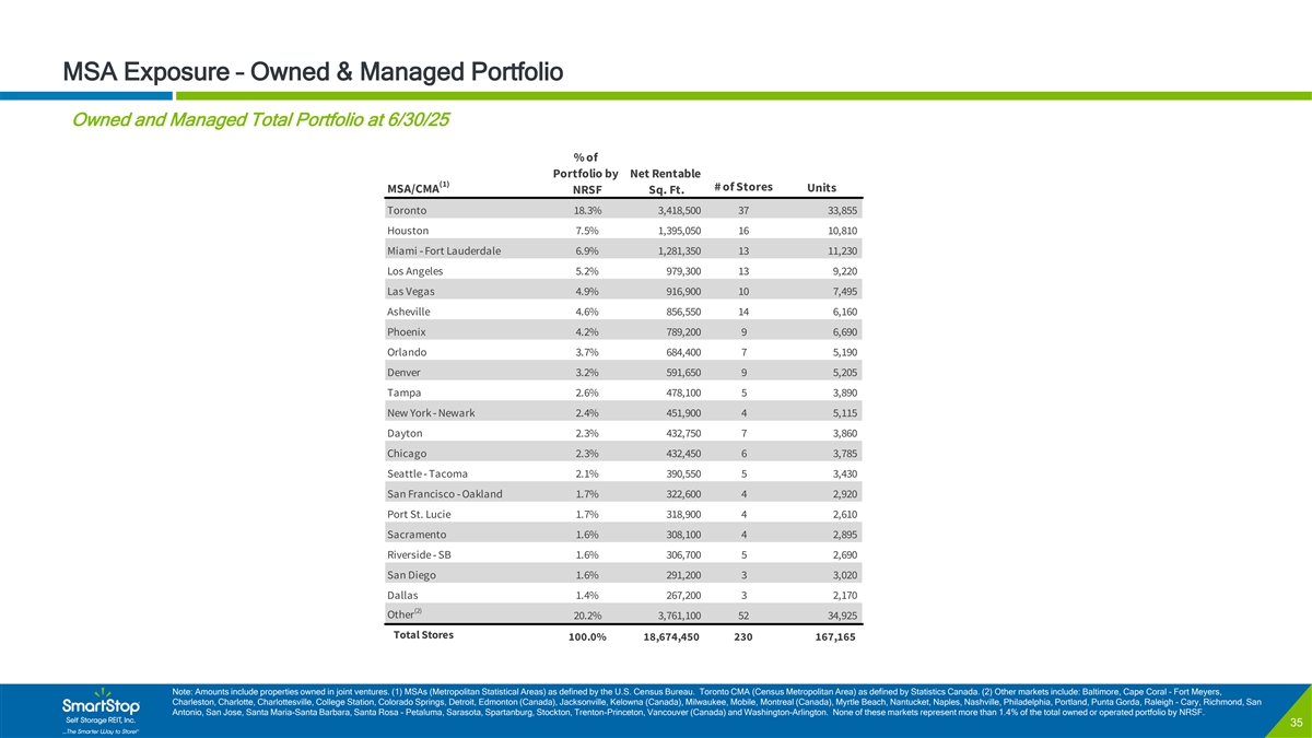 /Admin/ADVANCED GRAPHICS FILES/Cover and Template/2024/2024_01/4159141-001_Trevor McMillin_SmartStop_Cover & Template C O N F I D E N T I A L COLOR PALETTE Text MSA Exposure – Total Portfolio 50 56 62 Title bar/Bullets Wholly-Owned Total Portfolio at 6/30/25 1 124 186 ACCENTS 1 126 124 211 % of Portfolio % of Portfolio Net Rentable 1 186 254 (1) MSA/CMA Units by NRSF by NOI Sq. Ft. # of Stores 127 212 Miami - Fort Lauderdale 9.0% 11.8% 1, 212,850 12 10 ,470 188 253 2 3 129 Houston 8.5% 5.4% 1,145,550 14 9,000 32 140 Toronto 8.3% 10.5% 1, 110,700 13 10 ,610 56 168 3 100 218 Los Angeles 6.6% 9.7% 88 2,000 12 8,290 0 141 157 220 Las Vegas 6.4% 6.3% 86 5,000 9 7,160 4 226 255 Asheville 5.9% 5.3% 79 2,450 13 5,680 166 219 166 219 5 Denver 4.4% 3.0% 591,650 9 5,205 166 219 Tampa 3.6% 3.0% 478,100 5 3,890 1 126 Hyperlink 124 211 Dayton 3.2% 1.9% 432,750 7 3,860 186 254 Chicago 3.2% 2.4% 43 2,450 6 3,785 127 212 Followed 188 253 Hyperlink Seattle - Tacoma 2.9% 3.2% 39 0,550 5 3,430 3 129 New York - Newark 2.9% 2.8% 386,000 3 4,385 TABLE 50 Phoenix 2.4% 2.2% 32 9,100 4 3,130 56 Lines 62 San Francisco - Oakland 2.4% 2.8% 322,600 4 2,920 1 Port St. Lucie 2.4% 2.0% 318,900 4 2,610 124 Highlights Sacramento 2.3% 1.4% 308,100 4 2,895 186 Riverside - SB 2.3% 2.6% 306,700 5 2,690 Detroit 2.0% 1.7% 266,100 4 2,220 Myrtle Beach 1.5% 1.0% 197,800 2 1,450 (2) Other 19.8% 21.0% 2, 692,700 36 24 ,545 Total Stores 100.0% 100.0% 13,462,050 171 118,225 (1) MSAs (Metropolitan Statistical Areas) as defined by the U.S. Census Bureau. Toronto CMA (Census Metropolitan Area) as defined by Statistics Canada. (2) Other markets include: Baltimore, Charleston, Charlotte, Charlottesville, College Station, Colorado Springs, Dallas, Jacksonville, Kelowna, Milwaukee, Mobile, Nantucket, Naples, Nashville, Orlando, Punta Gorda, Raleigh - Cary, San Antonio, San Diego, San Jose, Santa Maria-Santa Barbara, Santa Rosa - Petaluma, Sarasota, Spartanburg, Stockton, Trenton-Princeton and Washington-Arlington. None of these markets represent more than 1.5% of the total portfolio by NRSF. 34