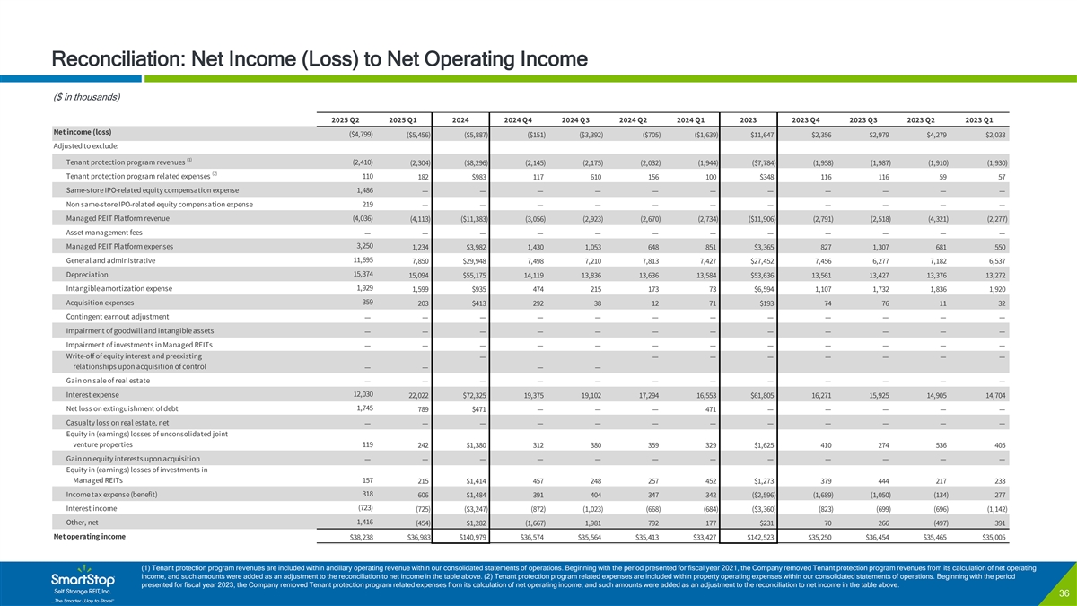 /Admin/ADVANCED GRAPHICS FILES/Cover and Template/2024/2024_01/4159141-001_Trevor McMillin_SmartStop_Cover & Template C O N F I D E N T I A L COLOR PALETTE Text Reconciliation: Net Income (Loss) to Net Operating Income 50 56 62 Title bar/Bullets ($ in thousands) 1 124 186 2025 Q2 2025 Q1 2024 2024 Q4 2024 Q3 2024 Q2 2024 Q1 2023 2023 Q4 2023 Q3 2023 Q2 2023 Q1 ACCENTS Net income (loss) ($4,799) ($5,456) ($5,887) ($151) ($3,392) ($705) ($1,639) $11,647 $2,356 $2,979 $4,279 $2,033 1 126 124 211 Adjusted to exclude: 1 186 254 (1) Tenant protection program revenues (2,410) ( 2,304) ($8,296) ( 2,145) (2,175) (2,032) ( 1,944) ($7,784) ( 1,958) (1,987) (1,910) ( 1,930) 127 212 (2) Tenant protection program related expenses 110 182 $983 117 610 156 100 $348 116 116 59 57 188 253 2 3 129 Same-store IPO-related equity compensation expense 1,486 — — — — — — — — — — — Non same-store IPO-related equity compensation expense 219 32 140 — — — — — — — — — — — 56 168 3 Managed REIT Platform revenue (4,036) ( 4,113) ($11,383) ( 3,056) (2,923) ( 2,670) (2,734) ($11,906) (2,791) ( 2,518) ( 4,321) (2,277) 100 218 Asset management fees — — — — — — — — — — — — 0 141 157 220 Managed REIT Platform expenses 3,250 1,234 $3,982 1,430 1,053 648 851 $3,365 827 1 ,307 681 550 4 226 255 General and administrative 11,695 7 ,850 $29,948 7 ,498 7,210 7,813 7,427 $27,452 7 ,456 6,277 7,182 6 ,537 166 219 Depreciation 15,374 15,094 $55,175 14,119 13,836 1 3,636 1 3,584 $53,636 13,561 13,427 1 3,376 1 3,272 166 219 5 166 219 Intangible amortization expense 1,929 1 ,599 $935 474 215 173 73 $6,594 1,107 1 ,732 1 ,836 1 ,920 Acquisition expenses 359 203 $413 292 38 12 71 $193 74 76 11 32 1 126 Hyperlink 124 211 Contingent earnout adjustment — — — — — — — — — — — — 186 254 Impairment of goodwill and intangible assets — — — — — — — — — — — — 127 212 Followed Impairment of investments in Managed REITs 188 253 — — — — — — — — — — — — Hyperlink 3 129 Write-off of equity interest and preexisting — — — — — — — — relationships upon acquisition of control — — — — TABLE Gain on sale of real estate — — — — — — — — — — — — 50 56 12,030 Lines Interest expense 2 2,022 $72,325 19,375 19,102 17,294 1 6,553 $61,805 16,271 1 5,925 1 4,905 1 4,704 62 1,745 Net loss on extinguishment of debt 789 $471 — — — 471 — — — — — 1 Casualty loss on real estate, net — — — — — — — — — — — — 124 Highlights Equity in (earnings) losses of unconsolidated joint 186 venture properties 119 242 $1,380 312 380 359 329 $1,625 410 274 536 405 Gain on equity interests upon acquisition — — — — — — — — — — — — Equity in (earnings) losses of investments in Managed REITs 157 215 $1,414 457 248 257 452 $1,273 379 444 217 233 Income tax expense (benefit) 318 606 $1,484 391 404 347 342 ($2,596) (1,689) (1,050) (134) 277 Interest income (723) (725) ($3,247) ( 872) ( 1,023) ( 668) ( 684) ($3,360) ( 823) ( 699) (696) (1,142) Other, net 1,416 ( 454) $1,282 (1,667) 1,981 792 177 $231 70 266 ( 497) 391 Net operating income $38,238 $36,983 $140,979 $36,574 $35,564 $35,413 $33,427 $142,523 $35,250 $36,454 $35,465 $35,005 (1) Tenant protection program revenues are included within ancillary operating revenue within our consolidated statements of operations. Beginning with the period presented for fiscal year 2021, the Company removed Tenant protection program revenues from its calculation of net operating income, and such amounts were added as an adjustment to the reconciliation to net income in the table above. (2) Tenant protection program related expenses are included within property operating expenses within our consolidated statements of operations. Beginning with the period presented for fiscal year 2023, the Company removed Tenant protection program related expenses from its calculation of net operating income, and such amounts were added as an adjustment to the reconciliation to net income in the table above. 36