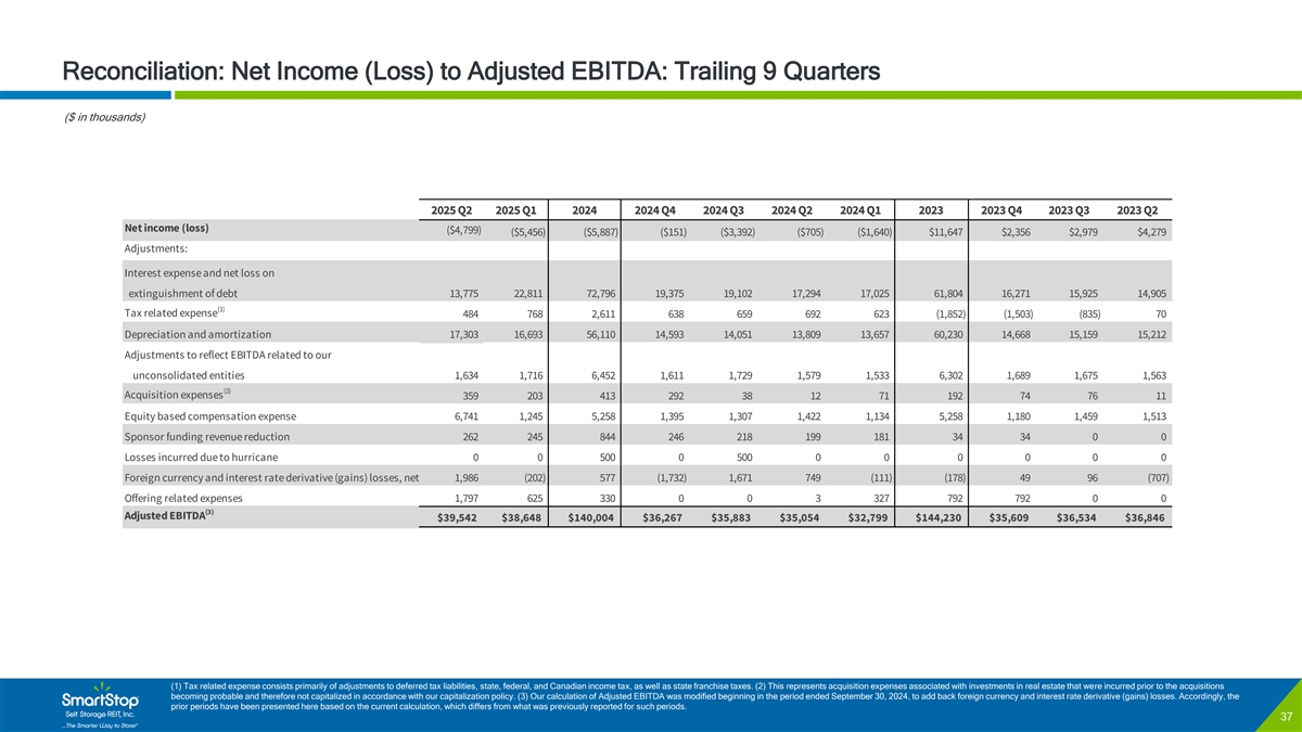 /Admin/ADVANCED GRAPHICS FILES/Cover and Template/2024/2024_01/4159141-001_Trevor McMillin_SmartStop_Cover & Template C O N F I D E N T I A L COLOR PALETTE Text Reconciliation: Net Income (Loss) to Adjusted EBITDA: Trailing 9 Quarters 50 56 62 Title bar/Bullets ($ in thousands) 1 124 186 ACCENTS 1 126 124 211 1 186 254 127 212 2025 Q2 2025 Q1 2024 2024 Q4 2024 Q3 2024 Q2 2024 Q1 2023 2023 Q4 2023 Q3 2023 Q2 188 253 2 3 129 Net income (loss) ($4,799) ($5,456) ($5,887) ($151) ($3,392) ($705) ($1,640) $11,647 $2,356 $2,979 $4,279 32 140 Adjustments: 56 168 3 100 218 Interest expense and net loss on 0 141 extinguishment of debt 13,775 22,811 72,796 19,375 19,102 17,294 17,025 61,804 16,271 15,925 14,905 157 220 4 226 255 (1) Tax related expense 484 768 2,611 638 659 692 623 (1,852) (1,503) (835) 70 166 219 Depreciation and amortization 17,303 16,693 56,110 14,593 14,051 13,809 13,657 60,230 14,668 15,159 15,212 166 219 5 166 219 Adjustments to reflect EBITDA related to our 1 126 unconsolidated entities 1,634 1,716 6,452 1,611 1,729 1,579 1,533 6,302 1,689 1,675 1,563 Hyperlink 124 211 186 254 (2) Acquisition expenses 359 203 413 292 38 12 71 192 74 76 11 127 212 Followed 188 253 Equity based compensation expense 6,741 1,245 5,258 1,395 1,307 1,422 1,134 5,258 1,180 1,459 1,513 Hyperlink 3 129 Sponsor funding revenue reduction 262 245 844 246 218 199 181 34 34 0 0 TABLE Losses incurred due to hurricane 0 0 500 0 500 0 0 0 0 0 0 50 56 Lines Foreign currency and interest rate derivative (gains) losses, net 1,986 (202) 577 (1,732) 1,671 749 (111) (178) 49 96 (707) 62 Offering related expenses 1,797 625 330 0 0 3 327 792 792 0 0 1 (3) Adjusted EBITDA $39,542 $38,648 $140,004 $36,267 $35,883 $35,054 $32,799 $144,230 $35,609 $36,534 $36,846 124 Highlights 186 (1) Tax related expense consists primarily of adjustments to deferred tax liabilities, state, federal, and Canadian income tax, as well as state franchise taxes. (2) This represents acquisition expenses associated with investments in real estate that were incurred prior to the acquisitions becoming probable and therefore not capitalized in accordance with our capitalization policy. (3) Our calculation of Adjusted EBITDA was modified beginning in the period ended September 30, 2024, to add back foreign currency and interest rate derivative (gains) losses. Accordingly, the prior periods have been presented here based on the current calculation, which differs from what was previously reported for such periods. 37