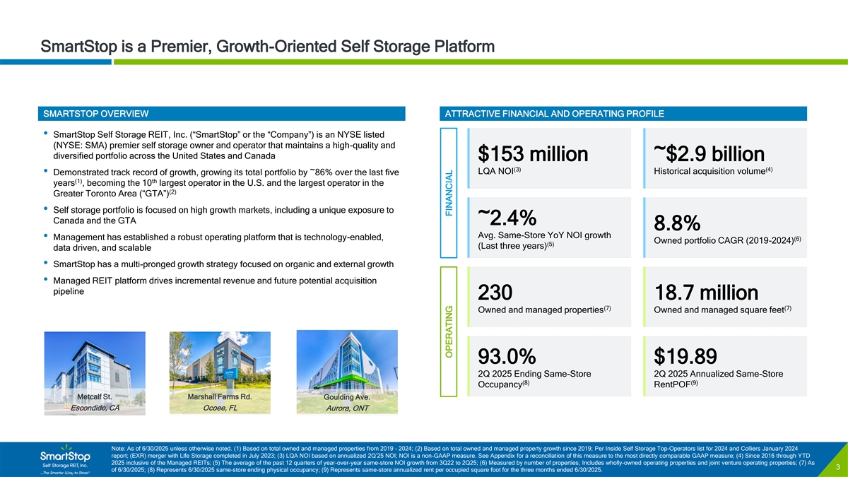 /Admin/ADVANCED GRAPHICS FILES/Cover and Template/2024/2024_01/4159141-001_Trevor McMillin_SmartStop_Cover & Template C O N F I D E N T I A L COLOR PALETTE Text SmartStop is a Premier, Growth-Oriented Self Storage Platform 50 56 62 Title bar/Bullets 1 124 186 ACCENTS 1 126 124 211 SMARTSTOP OVERVIEW ATTRACTIVE FINANCIAL AND OPERATING PROFILE 1 186 254 127 212 • SmartStop Self Storage REIT, Inc. (“SmartStop” or the “Company”) is an NYSE listed 188 253 2 (NYSE: SMA) premier self storage owner and operator that maintains a high-quality and 3 129 diversified portfolio across the United States and Canada $153 million ~$2.9 billion 32 140 56 168 3 (3) (4) LQA NOI Historical acquisition volume • Demonstrated track record of growth, growing its total portfolio by ~86% over the last five 100 218 (1) th years , becoming the 10 largest operator in the U.S. and the largest operator in the 0 141 (2) 157 220 Greater Toronto Area (“GTA”) 4 226 255 • Self storage portfolio is focused on high growth markets, including a unique exposure to 166 219 166 219 5 Canada and the GTA ~2.4% 166 219 8.8% Avg. Same-Store YoY NOI growth • Management has established a robust operating platform that is technology-enabled, (6) 1 126 Owned portfolio CAGR (2019-2024) (5) Hyperlink 124 211 (Last three years) data driven, and scalable 186 254 127 212• SmartStop has a multi-pronged growth strategy focused on organic and external growth Followed 188 253 Hyperlink 3 129 • Managed REIT platform drives incremental revenue and future potential acquisition TABLE pipeline 230 18.7 million 50 (7) (7) 56 Lines Owned and managed properties Owned and managed square feet 62 1 124 Highlights 186 93.0% $19.89 2Q 2025 Ending Same-Store 2Q 2025 Annualized Same-Store (8) (9) Occupancy RentPOF Metcalf St. Marshall Farms Rd. Goulding Ave. Escondido, CA Ocoee, FL Aurora, ONT Note: As of 6/30/2025 unless otherwise noted. (1) Based on total owned and managed properties from 2019 – 2024; (2) Based on total owned and managed property growth since 2019; Per Inside Self Storage Top-Operators list for 2024 and Colliers January 2024 report; (EXR) merger with Life Storage completed in July 2023; (3) LQA NOI based on annualized 2Q’25 NOI; NOI is a non-GAAP measure. See Appendix for a reconciliation of this measure to the most directly comparable GAAP measure; (4) Since 2016 through YTD 2025 inclusive of the Managed REITs; (5) The average of the past 12 quarters of year-over-year same-store NOI growth from 3Q22 to 2Q25; (6) Measured by number of properties; Includes wholly-owned operating properties and joint venture operating properties; (7) As 3 of 6/30/2025; (8) Represents 6/30/2025 same-store ending physical occupancy; (9) Represents same-store annualized rent per occupied square foot for the three months ended 6/30/2025. OPERATING FINANCIAL