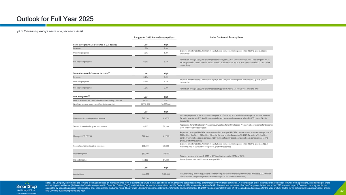 /Admin/ADVANCED GRAPHICS FILES/Cover and Template/2024/2024_01/4159141-001_Trevor McMillin_SmartStop_Cover & Template C O N F I D E N T I A L COLOR PALETTE Text Outlook for Full Year 2025 50 56 62 Title bar/Bullets ($ in thousands, except share and per share data) 1 124 186 Ranges for 2025 Annual Assumptions Notes for Annual Assumptions ACCENTS 1 126 Same-store growth (as translated in U.S. dollars) Low High 124 211 1 Revenue 1.8% 2.8% 186 254 Excludes an estimated $3.4 million of equity based compensation expense related to IPO grants. (Not in Operating expense 4.3% 5.3% thousands) 127 212 188 253 2 Reflects an average USD/CAD exchange rate for full year 2024 of approximately 0.73x. The average USD/CAD 3 129 Net operating income 0.6% 1.6% exchange rate for the six months ended June 30, 2025 and June 30, 2024 was approximately 0.71x and 0.74x, respectively. 32 140 (6) 56 168 3 100 218 (1) Same-store growth (constant currency) Low High 0 141 Revenue 2.2% 3.2% 157 220 Excludes an estimated $3.4 million of equity based compensation expense related to IPO grants. (Not in 4 Operating expense 4.7% 5.7% 226 255 thousands) 166 219 Net operating income 1.0% 2.3% Reflects an average USD/CAD exchange rate of approximately 0.73x for full year 2024 and 2025. 166 219 5 166 219 (2) FFO, as Adjusted Low High 1 126 FFO, as adjusted per share & OP unit outstanding - diluted $1.85 $1.93 Hyperlink 124 211 186 254 Weighted average share count (not in thousands) 50,950,000 50,950,000 127 212 Followed 188 253 Low High Hyperlink 3 129 Includes properties in the non same-store pool as of June 30, 2025. Excludes tenant protection net revenues. Non same-store net operating income $18,750 $19,950 Excludes an estimated $3.4 million of equity based compensation expense related to IPO grants. (Not in TABLE thousands) 50 Represents Tenant Protection Program revenues less Tenant Protection Program related expense for the same- Tenant Protection Program net revenue $8,800 $9,200 56 Lines store and non same-store pools. 62 Represents Managed REIT Platform revenues less Managed REIT Platform expenses. Assumes average AUM of $925 million (low) to $1,025 million (high) for the year ending December 31, 2025. Excludes a $1.2 million 1 Managed REIT EBITDA $11,500 $12,500 contract termination cost expense and $2.0 million of equity based compensation expense related to IPO 124 Highlights grants. (Not in thousands) 186 Excludes an estimated $3.7 million of equity based compensation expense related to IPO grants and $2.4 General and administrative expenses $30,500 $31,300 million related to transactional expenses. (Not in thousands) Interest expense $60,700 $62,700 Assumes average one-month SOFR of 4.3% and average daily CORRA of 2.8%. Primarily associated with loans to Managed REITs. Interest income $4,100 $4,400 Low High Includes wholly-owned acquisitions and the Company's investment in joint ventures. Includes $232.4 million Acquisitions $350,000 $400,000 of acquisitions completed year-to-date as of August 6, 2025. (Not in thousands) Note: The Company’s estimates are forward-looking and based on management’s view of current and future market conditions. The Company’s actual results may differ materially from these estimates. A reconciliation of net income per share outlook to funds from operations, as adjusted per share outlook is provided below. (1) Stores in Canada are operated in Canadian Dollars (CAD), and their financial results are translated to U.S. Dollars (USD) in accordance with GAAP. These stores represent 13 of the Company's 149 stores in the 2025 same-store pool. Constant currency results are calculated by translating current year results at prior year average exchange rates. The average USD/CAD exchange rate for the 12 months ending December 31, 2024 was approximately 0.73x. (2) FFO, as adjusted estimates for the year are fully diluted for an estimated average number of shares and OP units outstanding during the year. 42