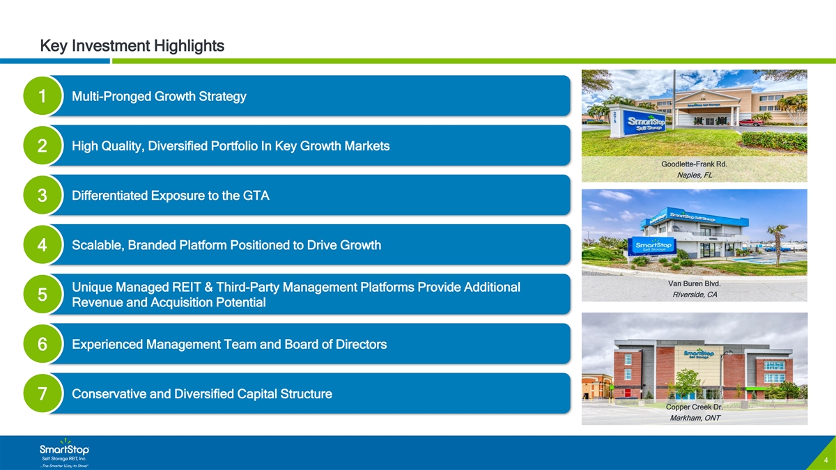 /Admin/ADVANCED GRAPHICS FILES/Cover and Template/2024/2024_01/4159141-001_Trevor McMillin_SmartStop_Cover & Template C O N F I D E N T I A L COLOR PALETTE Text Key Investment Highlights 50 56 62 Title bar/Bullets 1 124 186 ACCENTS Multi-Pronged Growth Strategy 1 1 126 124 211 1 186 254 127 212 188 253 2 3 129 High Quality, Diversified Portfolio In Key Growth Markets 2 32 140 Goodlette-Frank Rd. 56 168 3 100 218 Naples, FL 0 141 157 220 4 226 255 Differentiated Exposure to the GTA 3 166 219 166 219 5 166 219 1 126 Hyperlink 124 211 Scalable, Branded Platform Positioned to Drive Growth 186 254 4 127 212 Followed 188 253 Hyperlink 3 129 Van Buren Blvd. TABLE Unique Managed REIT & Third-Party Management Platforms Provide Additional Riverside, CA 50 5 Revenue and Acquisition Potential 56 Lines 62 1 124 Highlights 186 Experienced Management Team and Board of Directors 6 Conservative and Diversified Capital Structure 7 Copper Creek Dr. Markham, ONT 4