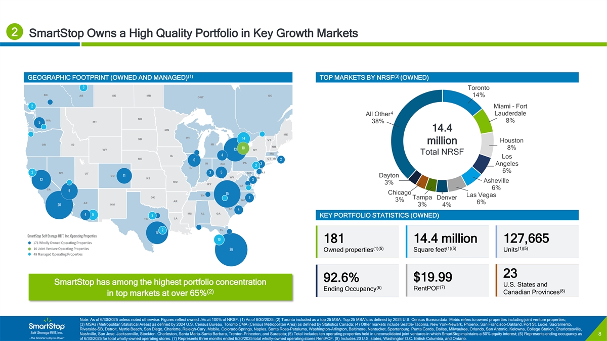 /Admin/ADVANCED GRAPHICS FILES/Cover and Template/2024/2024_01/4159141-001_Trevor McMillin_SmartStop_Cover & Template C O N F I D E N T I A L COLOR PALETTE Text 2 SmartStop Owns a High Quality Portfolio in Key Growth Markets 50 56 62 Title bar/Bullets 1 124 186 ACCENTS (1) (3) 1 126 GEOGRAPHIC FOOTPRINT (OWNED AND MANAGED) TOP MARKETS BY NRSF (OWNED) 124 211 1 186 254 Toronto 127 212 14% 188 253 2 3 129 Miami - Fort 4 Lauderdale All Other 32 140 56 168 3 8% 38% 100 218 14.4 0 141 157 220 4 Houston million 226 255 8% 166 219 Total NRSF Los 166 219 5 166 219 Angeles 1 126 6% Hyperlink 124 211 Dayton 186 254 Asheville 3% 6% 127 212 Followed Chicago 188 253 Las Vegas Hyperlink Tampa Denver 3 129 3% 6% 3% 4% TABLE KEY PORTFOLIO STATISTICS (OWNED) 50 56 Lines 62 1 181 14.4 million 127,665 124 Highlights 186 (1)(5) (1)(5) (1)(5) Square feet Units Owned properties 23 $19.99 92.6% SmartStop has among the highest portfolio concentration Toronto Tampa U.S. States and (7) (6) RentPOF Ending Occupancy (8) (2) Canadian Provinces in top markets at over 65% Miami/Fort Lauderdale Denver Las Vegas Chicago Note: As of 6/30/2025 unless noted otherwise. Figures reflect owned JVs at 100% of NRSF. (1) As of 6/30/2025; (2) Toronto included as a top 25 MSA. Top 25 MSA’s as defined by 2024 U.S. Census Bureau data. Metric refers to owned properties including joint venture properties; (3) MSAs (Metropolitan Statistical Areas) as defined by 2024 U.S. Census Bureau. Toronto CMA (Census Metropolitan Area) as defined by Statistics Canada; (4) Other markets include Seattle–Tacoma, New York–Newark, Phoenix, San Francisco–Oakland, Port St. Lucie, Sacramento, Riverside–SB, Detroit, Myrtle Beach, San Diego, Charlotte, Raleigh–Cary, Mobile, Colorado Springs, Naples, Santa Rosa–Petaluma, Washington-Arlington, Baltimore, Nantucket, Spartanburg, Punta Gorda, Dallas, Milwaukee, Orlando, San Antonio, Kelowna, College Station, Charlottesville, Asheville Dayton Nashville, San Jose, Jacksonville, Stockton, Charleston, Santa Maria-Santa Barbara, Trenton-Princeton, and Sarasota; (5) Total includes ten operating properties held in unconsolidated joint ventures in which SmartStop maintains a 50% equity interest; (6) Represents ending occupancy as 8 of 6/30/2025 for total wholly-owned operating stores. (7) Represents three months ended 6/30/2025 total wholly-owned operating stores RentPOF. (8) Includes 20 U.S. states, Washington D.C. British Columbia, and Ontario. (3) Houston All other Los Angeles